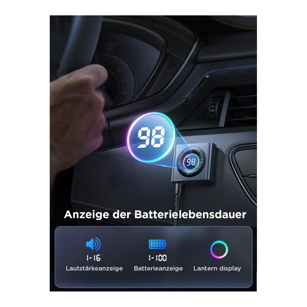 【Anzeige von Batteriestand und Lautstärke】Durch die Anzeige können wir den aktuellen Status der Leistungsstufe und Lautstärke des bluetooth adapter auto, rechtzeitige Erinnerung an das Aufladen, um Musik ohne Unterbrechung zu spielen. Wie zu bedienen: Tippen Sie auf die Anruftaste einmal, um die genaue Leistungsstufe zu kennen, drücken Sie die nach oben und unten Song zeigt die aktuelle Lautstärke.