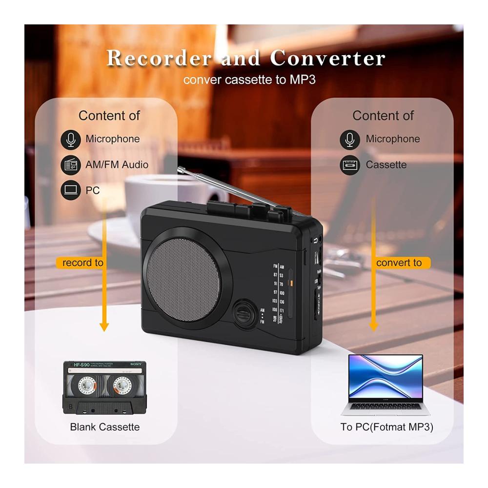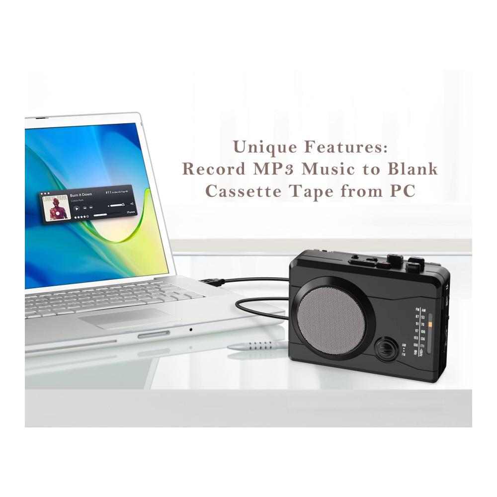 Whether youre looking to relive the nostalgic charm of old cassette tapes or digitize your favorite tracks, this cassette player has you covered. Its features include MP3 music recording from PC or Mac, external voice or built-in radio recording onto cassette, cassette to MP3 conversion, and playback of audio cassettes. Compact in design, it fits snugly into most large pockets or bags, making it highly portable with a detachable belt clip.