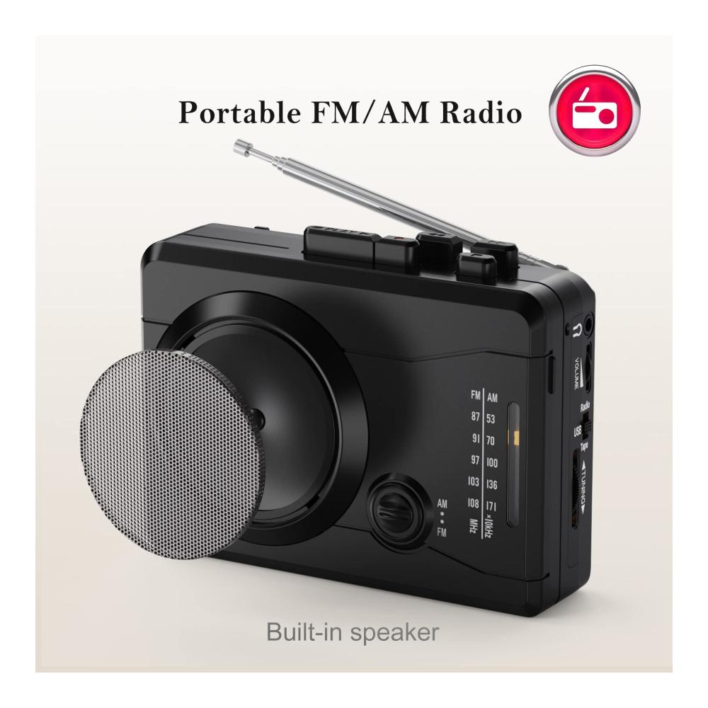 Funktionen – Musik, Radio, externe Sprache auf Kassette aufnehmen – Kassette in MP3 umwandeln – Audiokassetten abspielen – FM / AM-Radio – Automatische Kassettenrücklauffunktion, AM / FM-Radiozündung und Tuning-Bedienelemente. – USB-, Band- oder Radiooptionen. – Integrierte Lautsprecher und Mikrofon. – Teleskopantenne für besseren AM/FM-Radioempfang.