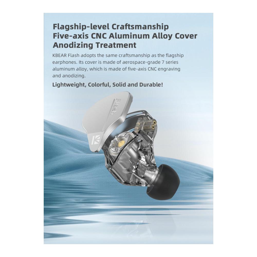【Handwerkskunst auf Flaggschiff-Niveau, Eloxalbehandlung】 Der KBEAR Flash In Ear Monitor übernimmt die gleiche Handwerkskunst wie die Flaggschiff-Kopfhörer. Die Abdeckung besteht aus einer Aluminiumlegierung der Serie 7 in Luft- und Raumfahrtqualität, die durch fünfachsige CNC-Gravur und Eloxierung hergestellt wird. Silberne und schwarze Metallabdeckungen werden mit verschiedenen transparenten PC-Hohlräumen kombiniert. Der gesamte Ohrhörer hat eine raffinierte Textur und ein glattes Gefühl.