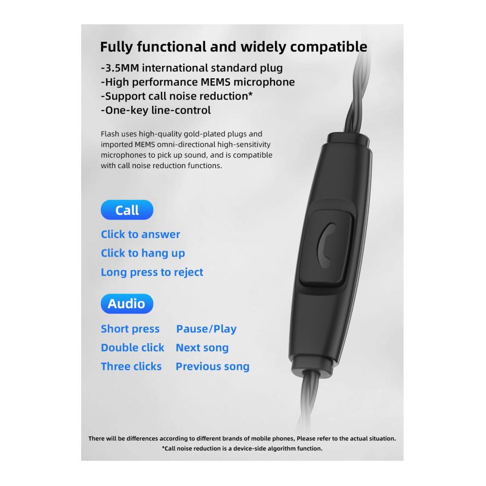 【Hochleistungs-MEMS-Mikrofon】 Flash IEM verwendet hochwertige vergoldete Stecker und importierte omnidirektionale MEMS-Mikrofone mit hoher Empfindlichkeit, um den Ton aufzunehmen, und ist mit Funktionen zur Reduzierung von Anrufgeräuschen kompatibel. Unterstützt Anrufrauschunterdrückung, Ein-Tasten-Leitungssteuerung.