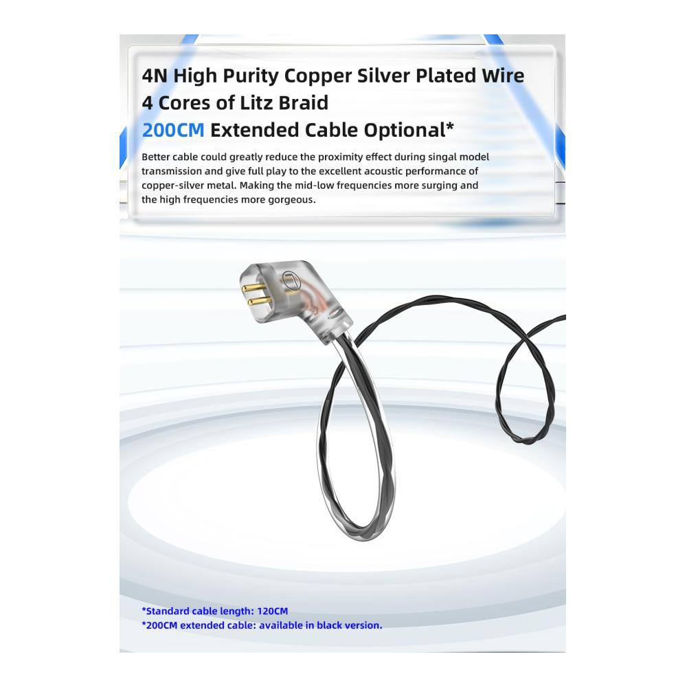 【4N hochreiner versilberter Kupferdraht】 Ein besseres Kabel könnte den Nahbesprechungseffekt bei der Übertragung von Einzelmodellen erheblich reduzieren und die hervorragende akustische Leistung von Kupfer-Silber-Metall voll zur Geltung bringen. Dadurch werden die mittleren und tiefen Frequenzen stärker anschwellend und die hohen Frequenzen wunderschöner.200CM Extended Cable optional.