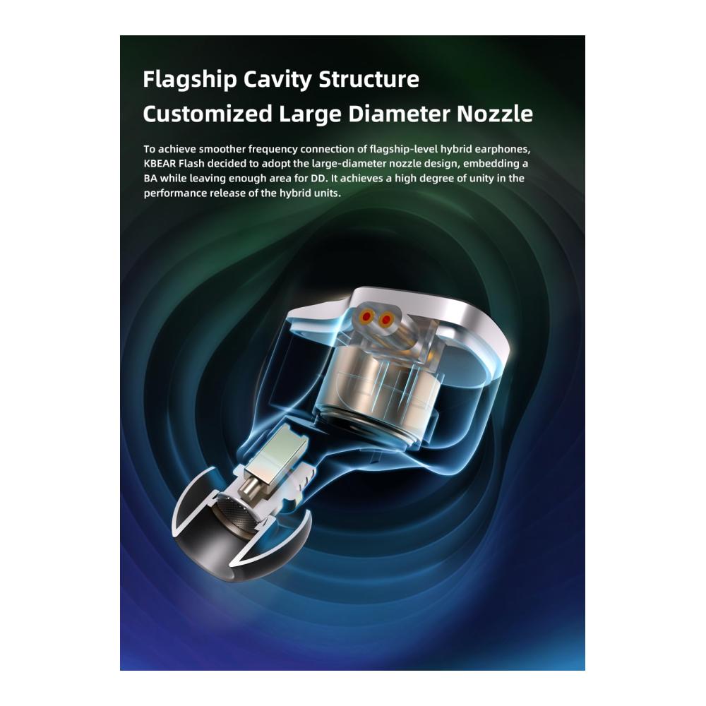 【Flaggschiff-Hohlraumstruktur】 Um eine reibungslosere Frequenzverbindung von Hybrid-Kopfhörern auf Flaggschiff-Niveau zu erreichen, entschied sich KBEAR Flash für das Düsendesign mit großem Durchmesser, bei dem ein BA eingebettet ist und gleichzeitig genügend Platz für DD bleibt. Er erreicht ein hohes Maß an Einheitlichkeit in der Leistungsfreigabe der Hybrideinheiten.