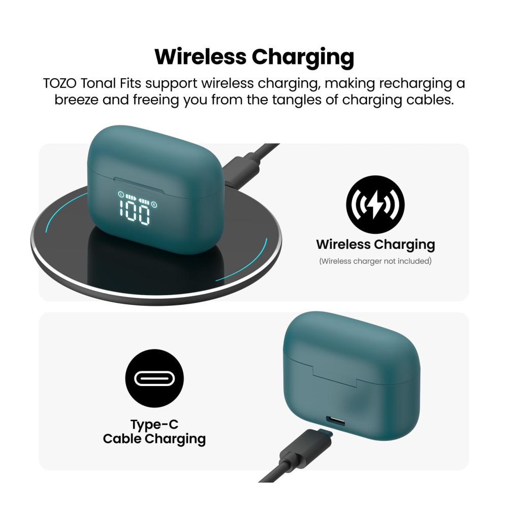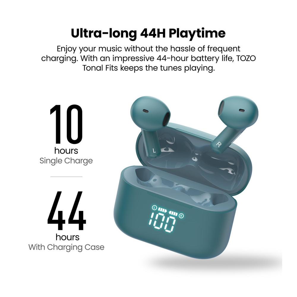 Genießen Sie lange Hörsessions ohne Unterbrechungen. TOZO Tonal Fits bieten eine erstaunliche Spielzeit von 44 Stunden. Verabschieden Sie sich von den Unannehmlichkeiten des häufigen Aufladens.