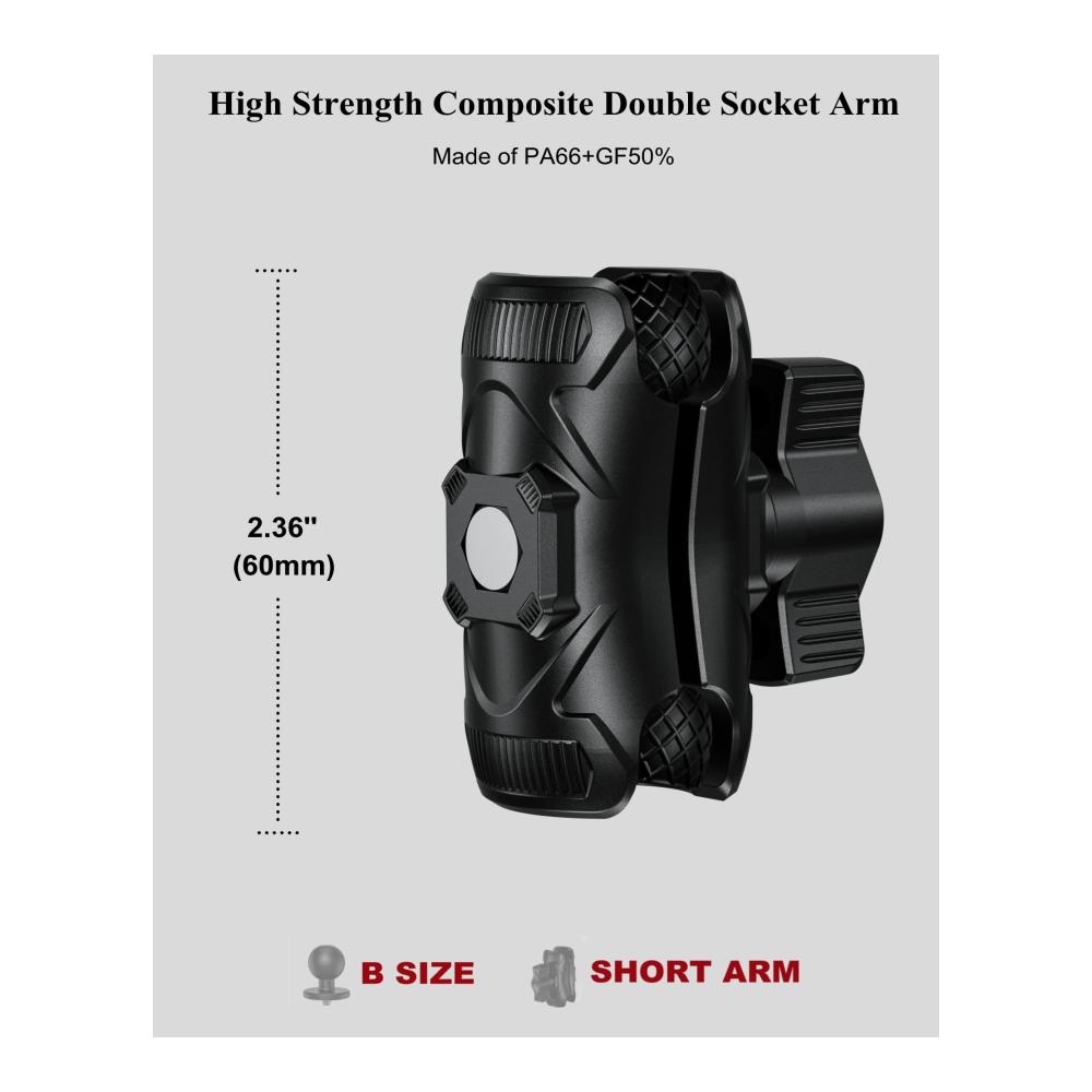 Dieser hochfeste Doppelbuchsenarm aus Verbundwerkstoff mit einer Gesamtlänge von 2,44 Zoll, kompatibel mit RAM MOUNTS & BRCOVAN allen Kugelkomponenten der B-Größe 1 Zoll, einschließlich Montagebasen und Gerätehaltern. Hauptkörper aus PA66 GF50% Material für Langlebigkeit und Zuverlässigkeit in den anspruchsvollsten Umgebungen. Hochfester Knopf mit Messinggewinde hält Ihre Montierung langfristig dicht. Nimmt eine hochwertige Mittelschraube aus Edelstahl und eine Industriefeder an.