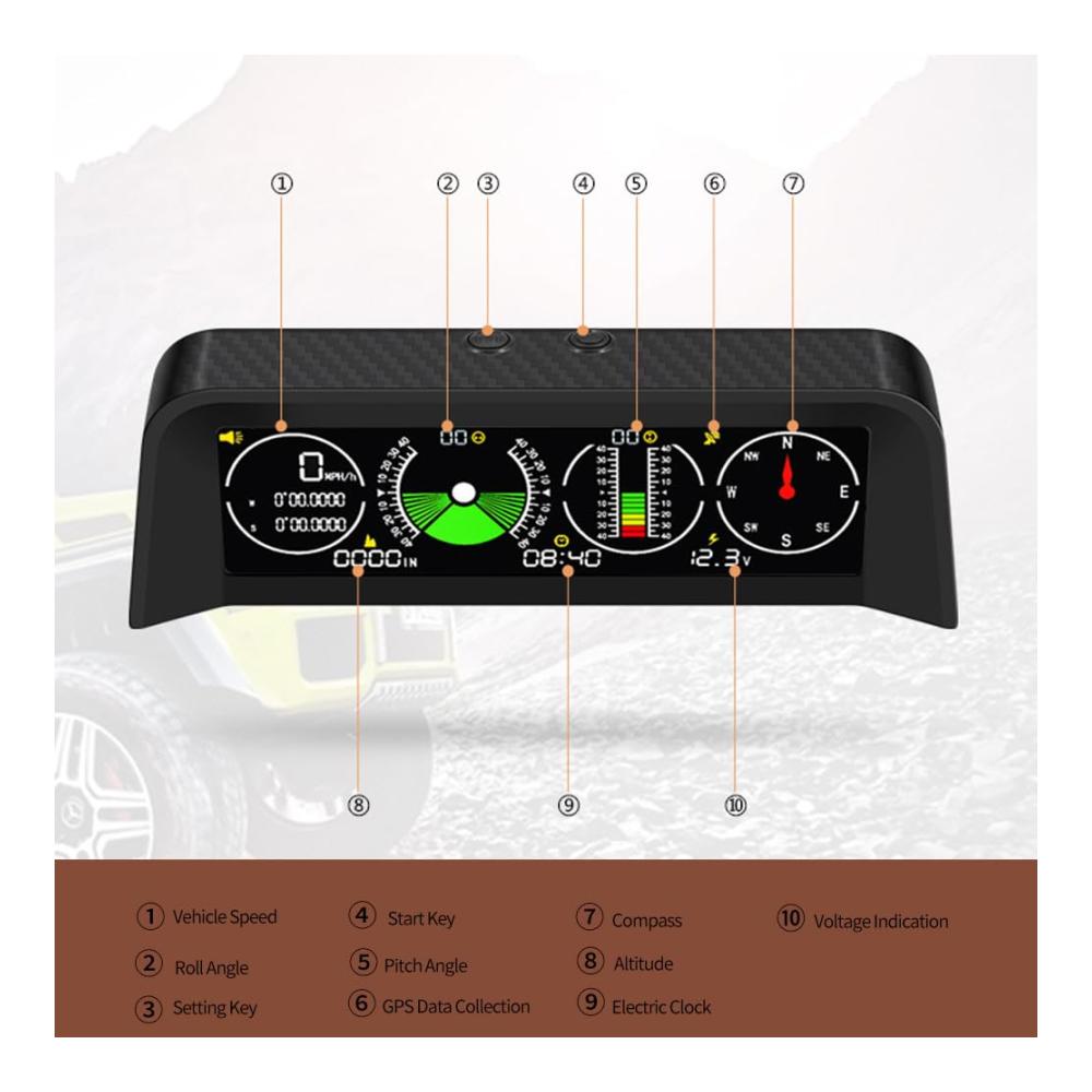 【Einfach zu installieren und zu verwenden】Parken Sie einfach das Auto auf einer ebenen Straße, kleben Sie den Kleber auf der Unterseite des Geräts und befestigen Sie es an dem Auto irgendwo im Auto für eine einfache Beobachtung, dann schließen Sie die Stromversorgung an, stellen Sie den Neigungsmesser auf Niveau, warten Sie, bis das Satelliten-GPS-Signal empfangen wird, bis alle Daten normal angezeigt werden, und dann können Sie fahren.Und das Produkt ist mit einem eingebauten Sensor ausgestattet, Das Display schaltet sich automatisch ein, wenn das Auto startet und schaltet sich aus, wenn das Auto ausgeschaltet wird.