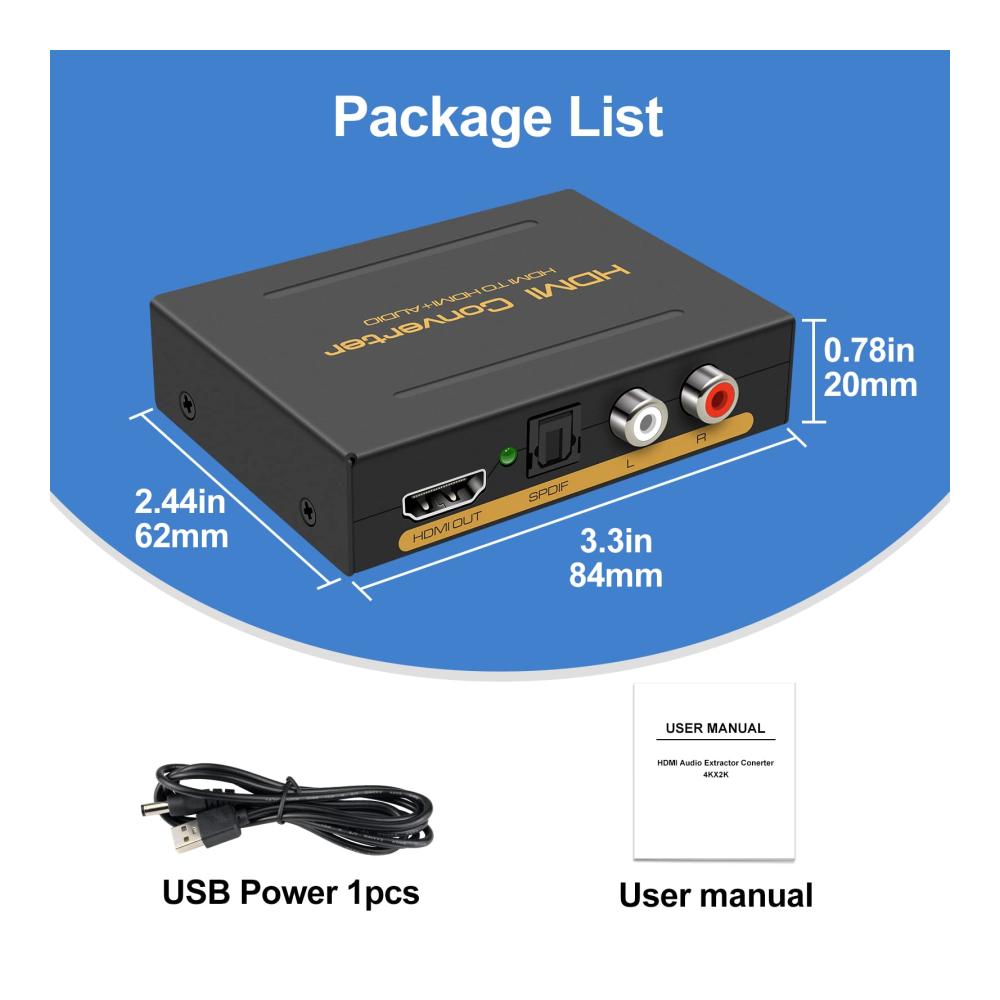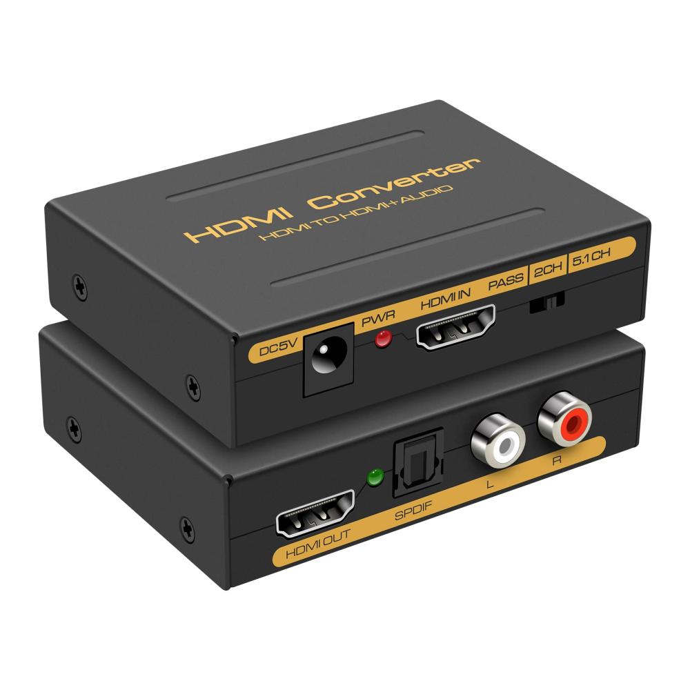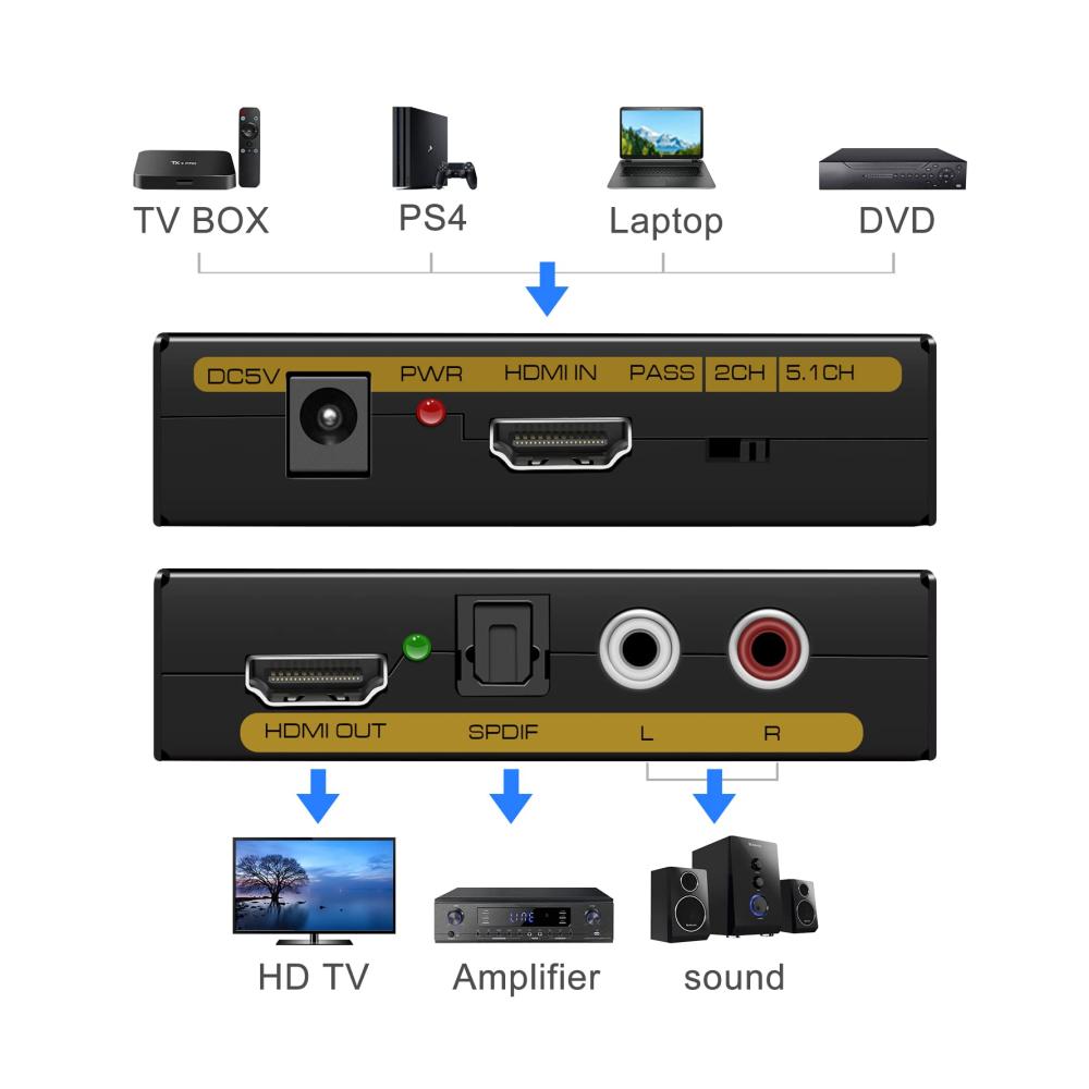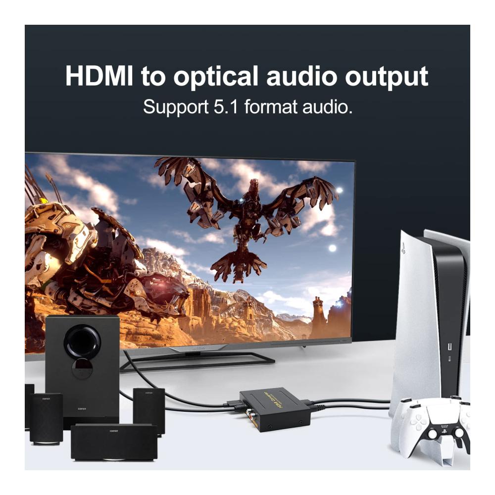 unterstützt ps5 audio konvertierungHDMI Audio Extractor 4K HDMI auf Optisch 3.5mm Audio Adapter Splitter Konverter RCA L/R Stereo Ausgang für PS5/4 Xbox Fire Stick Projektoren DVI Monitor | große KompatibilitätGeeignet für verschiedene HDMI-Quellgeräte, insbesondere Roku oder Chromecast und Blu-ray/DVD/HD-Player ohne eigenen Audioausgang, Kabel-/Satelliten-TV-Boxen, Amazon Fire TV, PS3/4, Xbox, PC/Laptops, High-Definition-Kameras, High-Definition-Festplatten-Videorecorder usw. | Unterstützung 4k/3DDieser HDMI-Audio-Konverter unterstützt Auflösungen bis zu 4K@60hz. Unterstützt das Video-Farbformat: 24bit/tiefe Farbe 30bit, 36bit synchroner Ton. Unterstützt HDMI1.4, HDCP 1.3 und DVI-Monitor. |