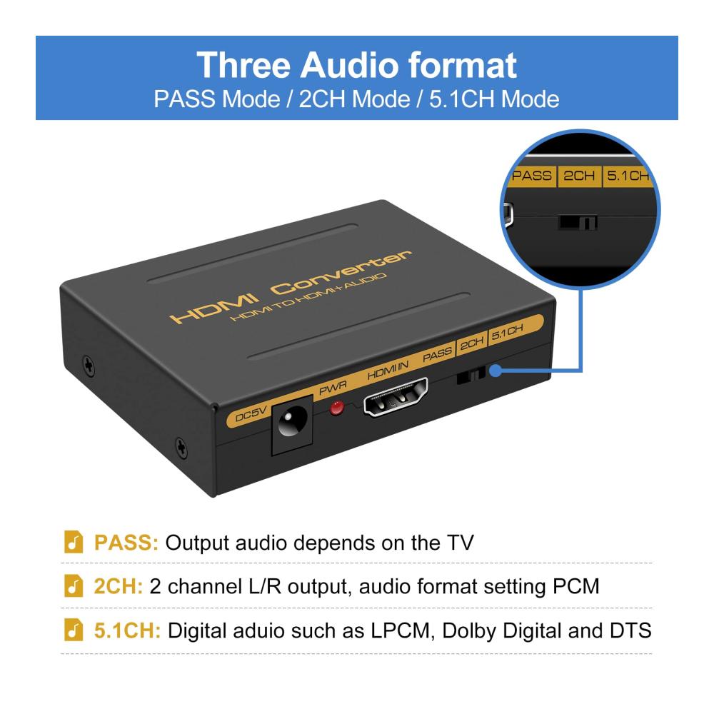 Die 3 Arbeitsmodi bieten Flexibilität: 5.1-Modus für optischen Ausgang, 2.0-Modus für Glasfaser und L/R Stereo im PCM-Format, sowie den Pass-Modus, der das Audioformat gemäß dem EDID des Anzeigegeräts ausgibt.