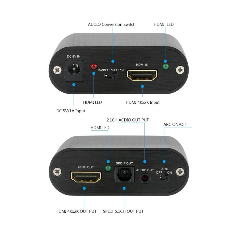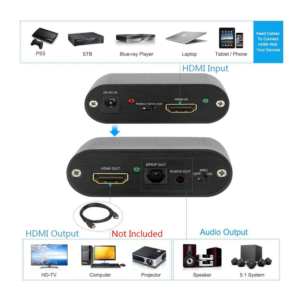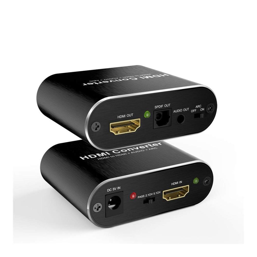 Dieser BolAAzuL HDMI-Audio-Extractor Splitter ist ein magisches Gerät, das das Audio aus einem HDMI-Signal extrahieren kann, so dass er an ein anderes Gerät gesendet werden kann – die ganze Zeit bleibt das ursprüngliche HDMI-Signal intakt. Eigenschaften: 1. Hinweis: 1) Um den HDMI-ARC (Audio Return Channel) zu verwenden, muss Ihr Fernseher HDMI ARC unterstützen. 2) Wenn Sie auf 5,1 CH umschalten, muss das Audiosystem, das an den 5,1 CH Anschluss angeschlossen ist, Decodierfunktionen haben. Andernfalls wird die Quelle DTS/Dolby-AC3 angezeigt und es wird kein Ton geben. 2. Anwendung: Projektor, Verstärker, Multimedia, TV-Box, DVD. 3. Unterstützt bis zu 4kX2K/60Hz Ein- und Ausschalten unter HDCP 1.4. 4. Lieferumfang: 1) HDMI-Audio-Splitter x 1. 2) USB-DC-Kabel. 1 x Bedienungsanleitung (evtl. nicht in deutscher Sprache).