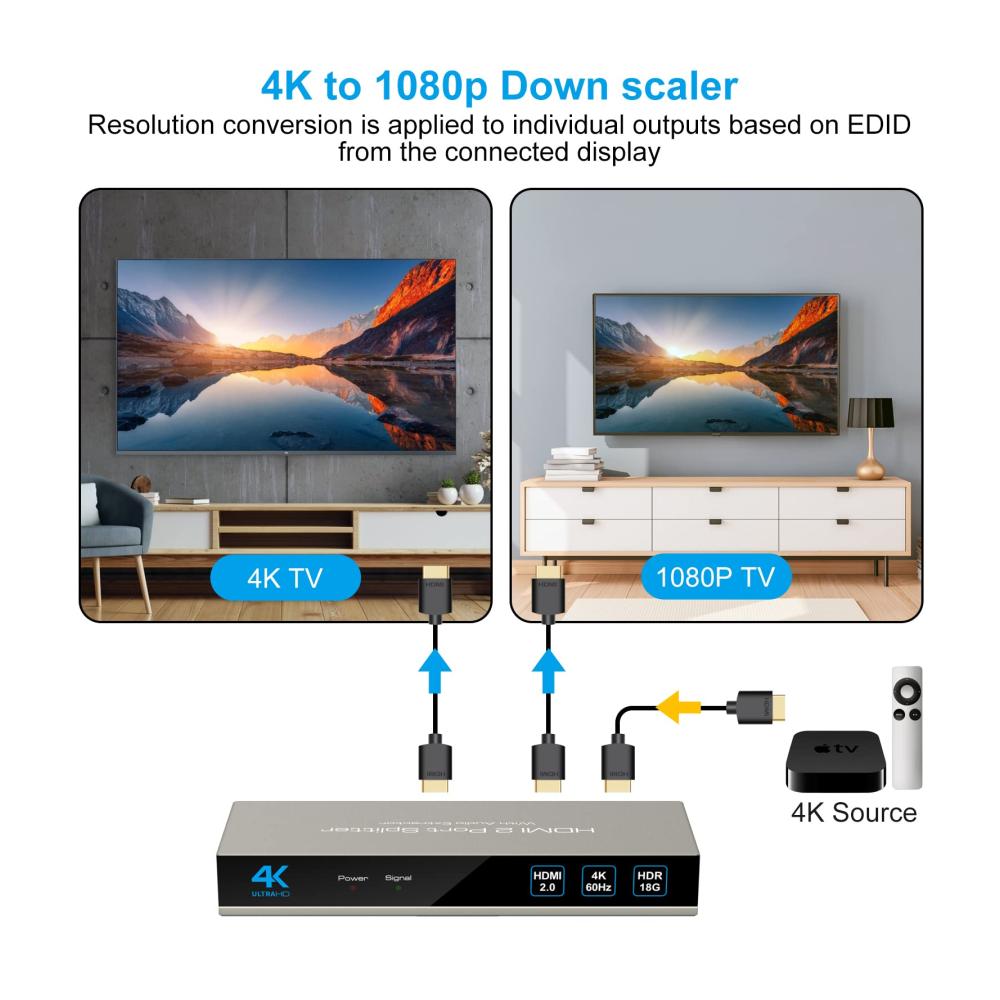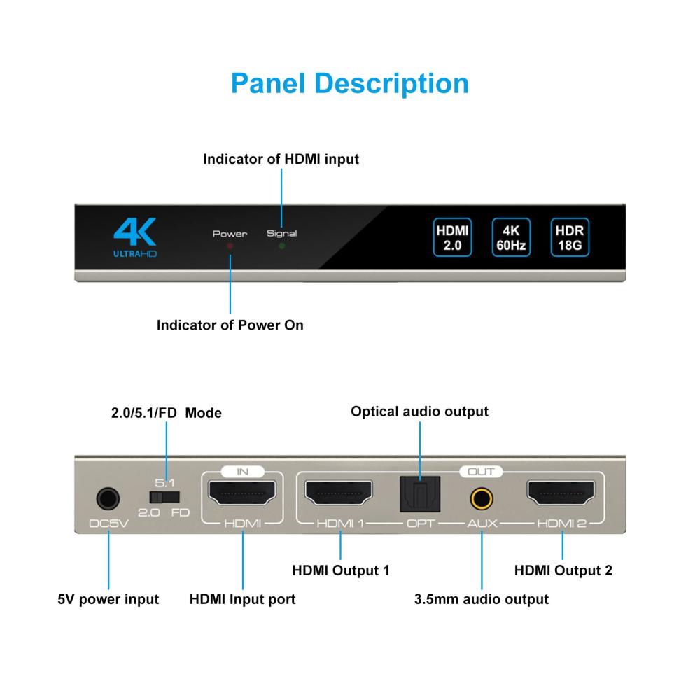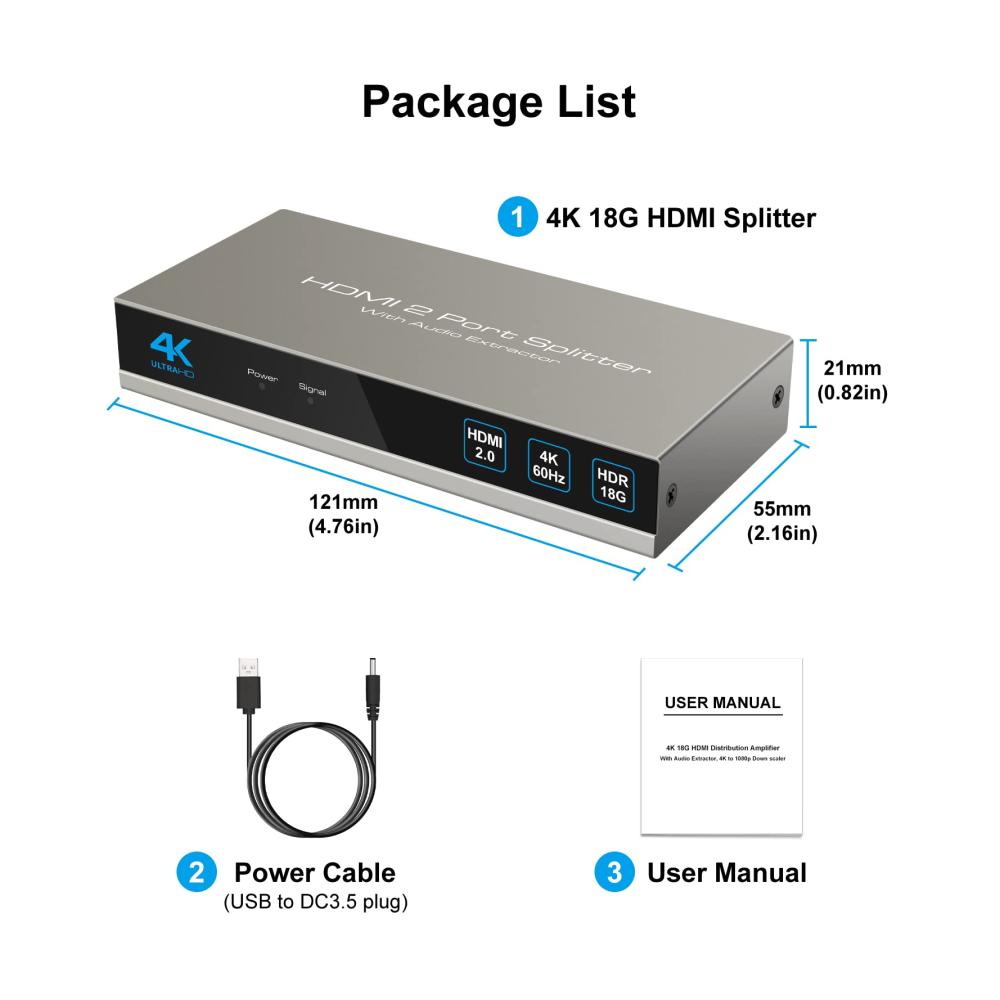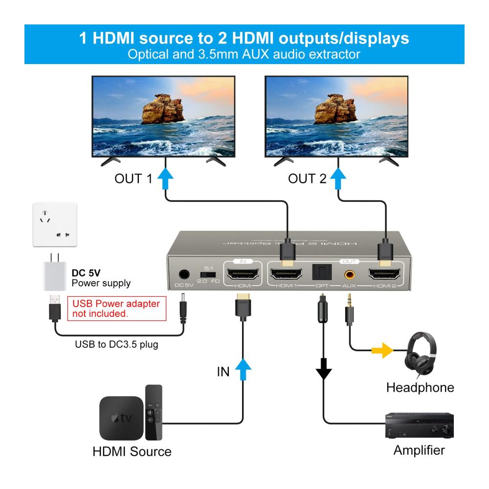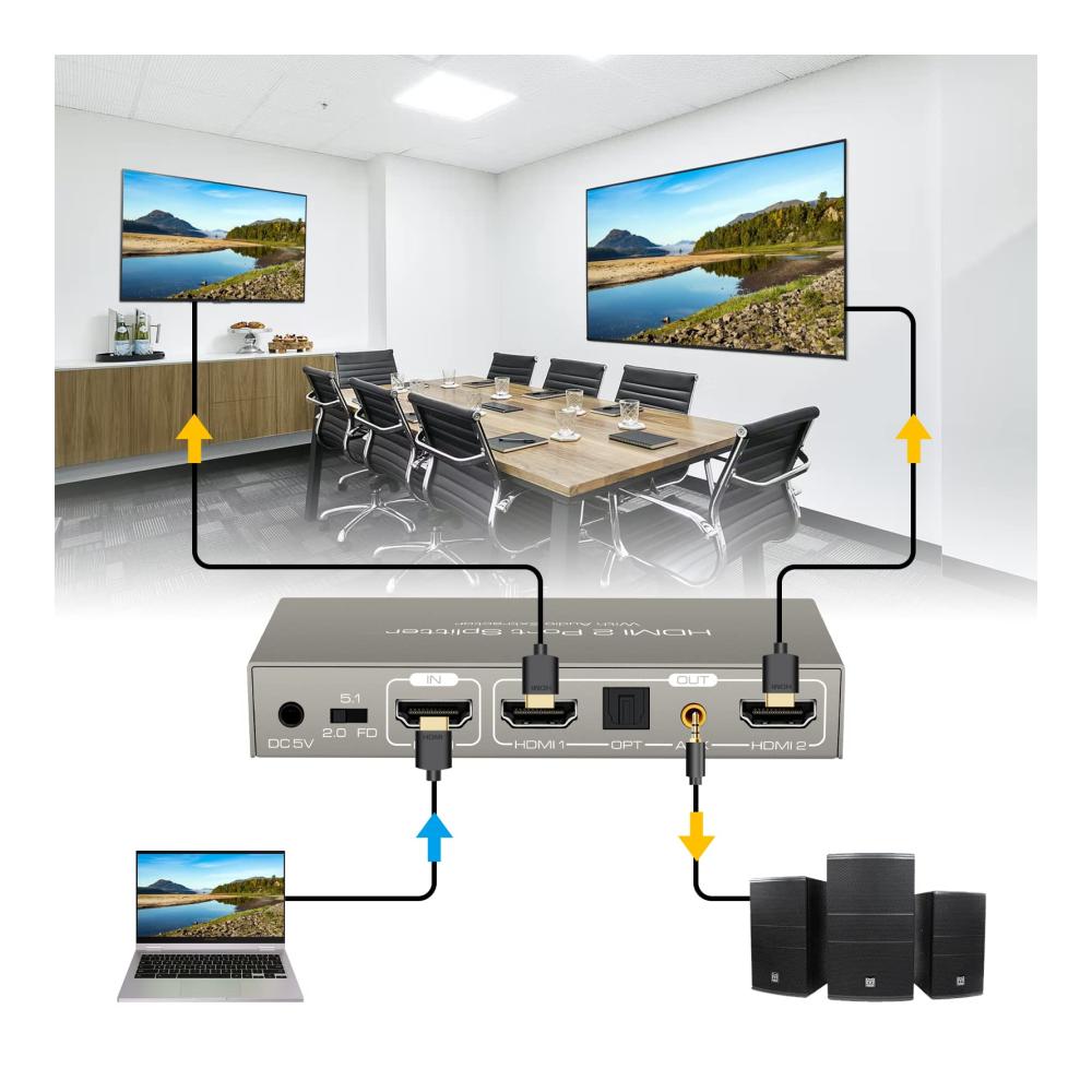 The 4K60Hz HDMI splitter 1 in 2 output with audio extractor can duplicate an HDMI signal simultaneously to two HDMI displays and extract audio signals from HDMI source that do not require dedicated audio output. It can support a lower to get 4K signal and a lower to get 1080P signal at the same time. * Note: do not extend only, only support mirrors.