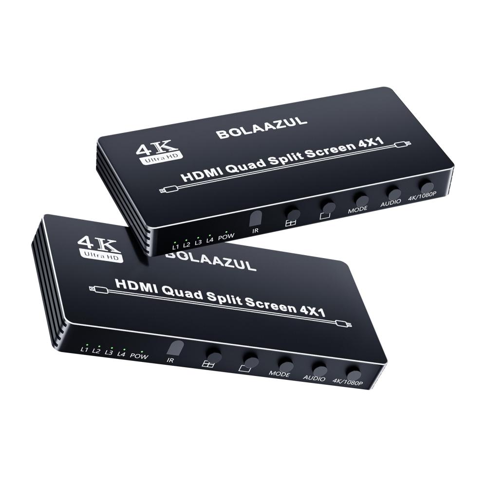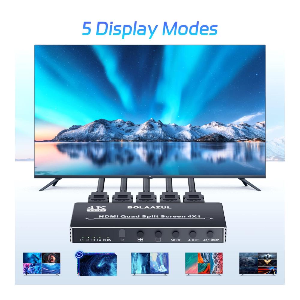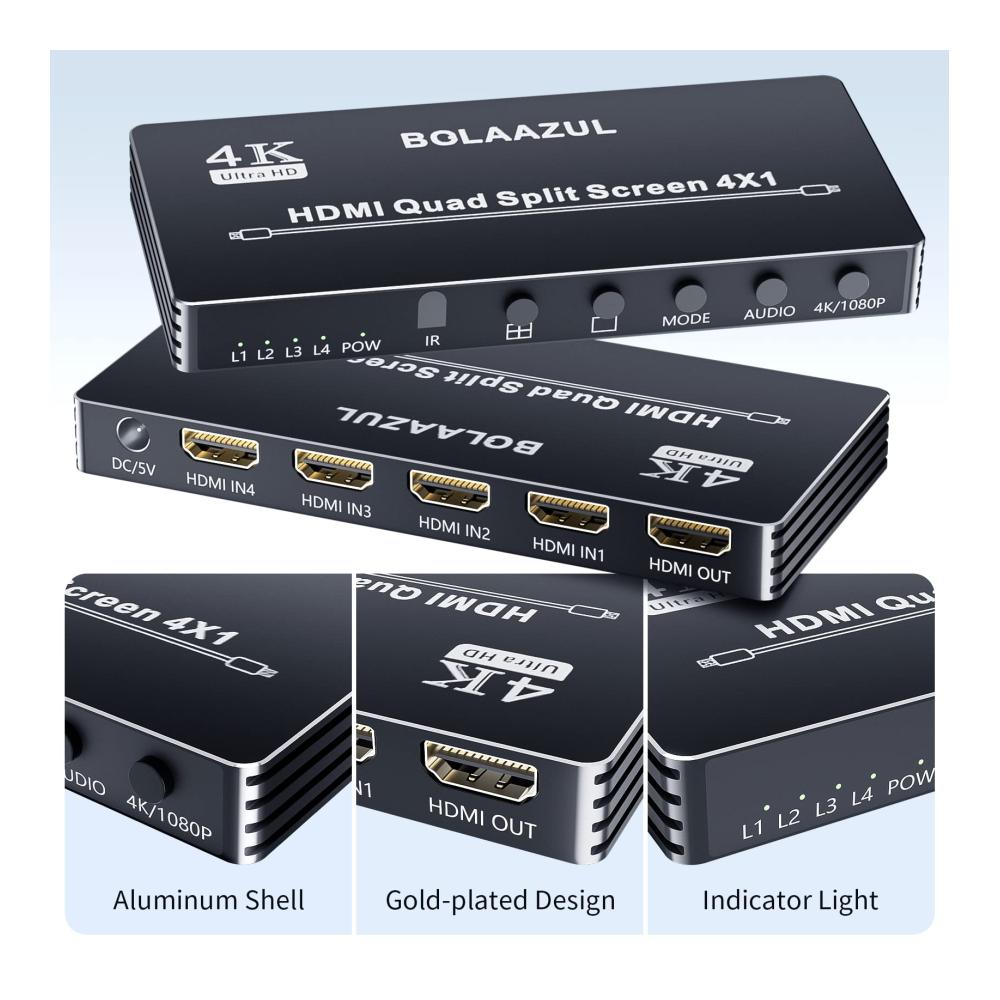 Unser HDMI Multiviewer 4×1 1080p BolAAzul 4 in 1 HDMI Quad-Bildschirm Multi Viewer Konverter bietet ultimative Vielseitigkeit für Ihr Entertainment-Erlebnis. Verbinden Sie mühelos bis zu vier HDMI-Audio-/Videoquellen mit einem HDMI-Fernseher, Projektor oder Monitor und genießen Sie die Flexibilität von fünf Anzeigemodi. Dieser nahtlose HDMI-Switcher bietet Ihnen ein beeindruckendes Seherlebnis mit kristallklarer Bildqualität und unübertroffener Leistung. Erweitern Sie Ihre Möglichkeiten mit unserem Umschaltpult
