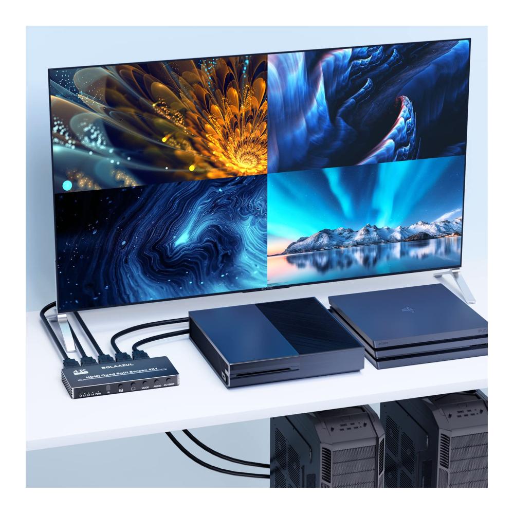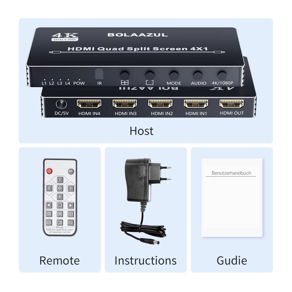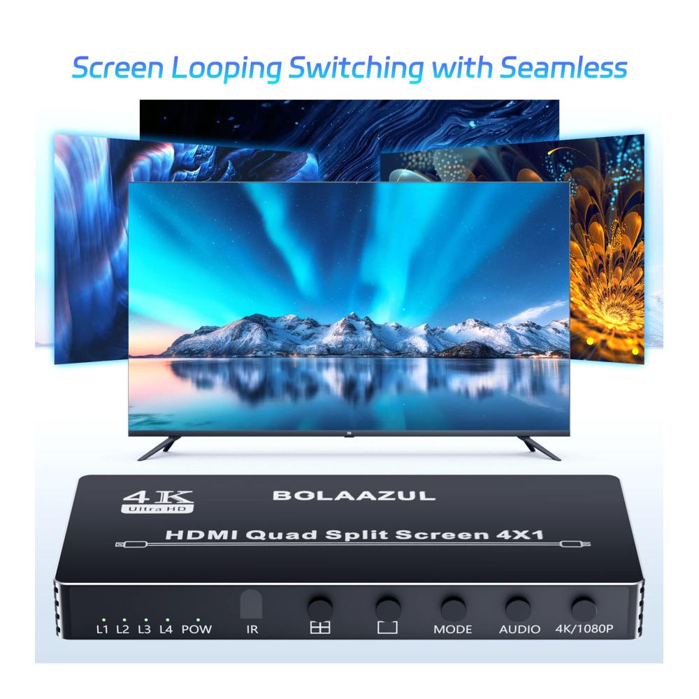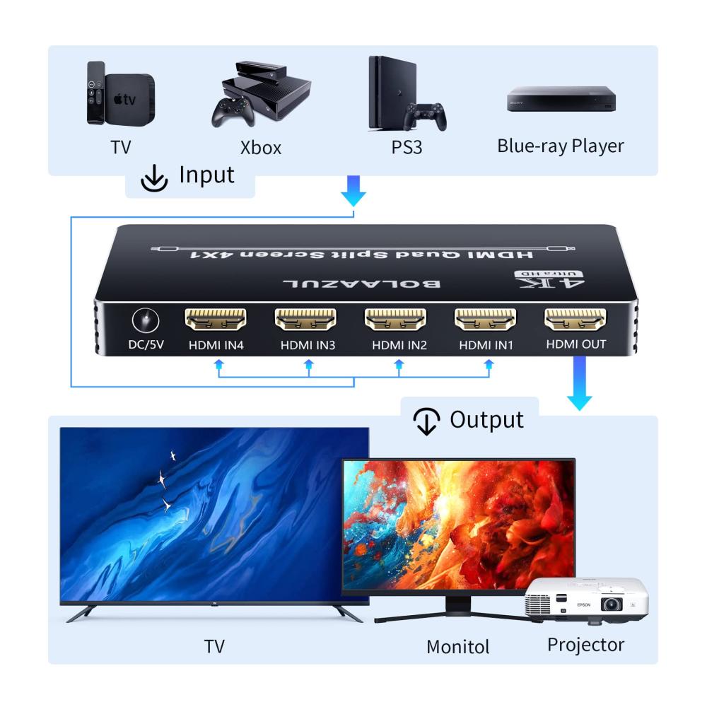 Unser HDMI Multiviewer 4×1 1080p BolAAzul 4 in 1 HDMI Quad-Bildschirm Multi Viewer Konverter bietet ultimative Vielseitigkeit für Ihr Entertainment-Erlebnis. Verbinden Sie mühelos bis zu vier HDMI-Audio-/Videoquellen mit einem HDMI-Fernseher, Projektor oder Monitor und genießen Sie die Flexibilität von fünf Anzeigemodi. Dieser nahtlose HDMI-Switcher bietet Ihnen ein beeindruckendes Seherlebnis mit kristallklarer Bildqualität und unübertroffener Leistung. Erweitern Sie Ihre Möglichkeiten mit unserem Umschaltpult