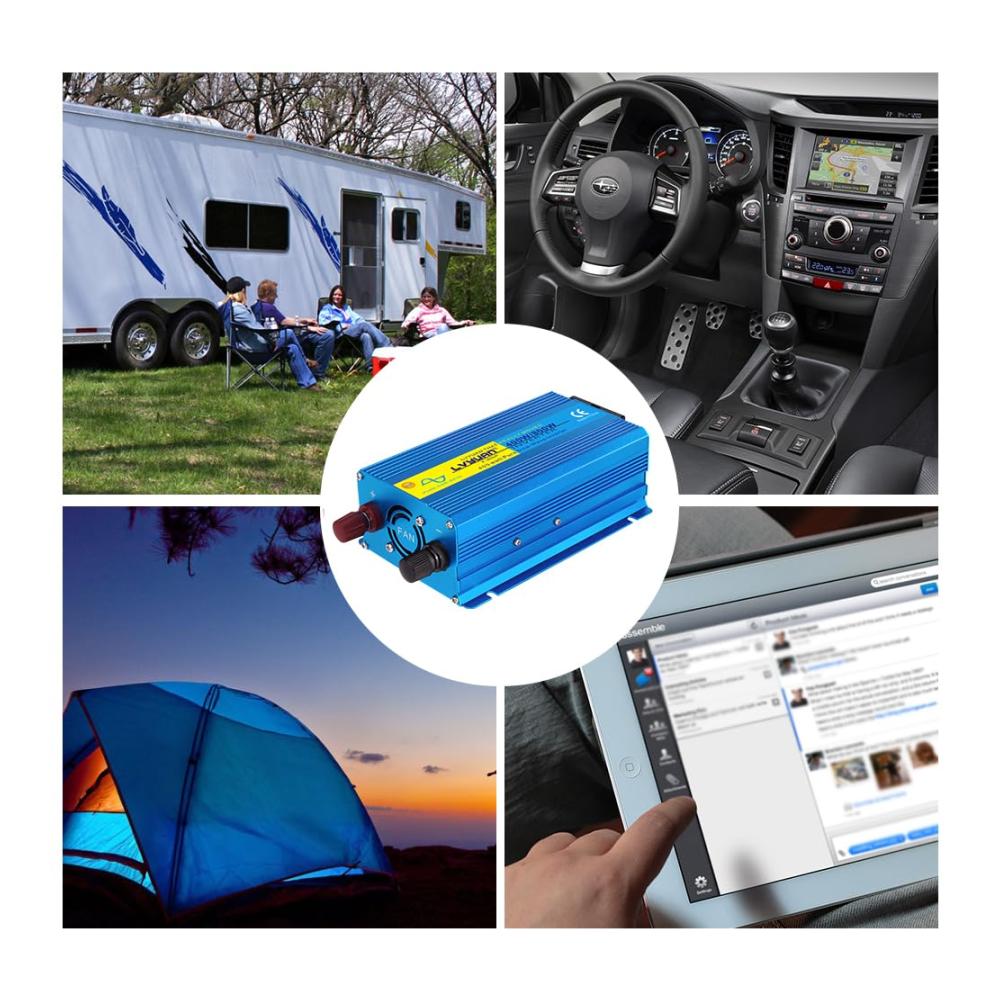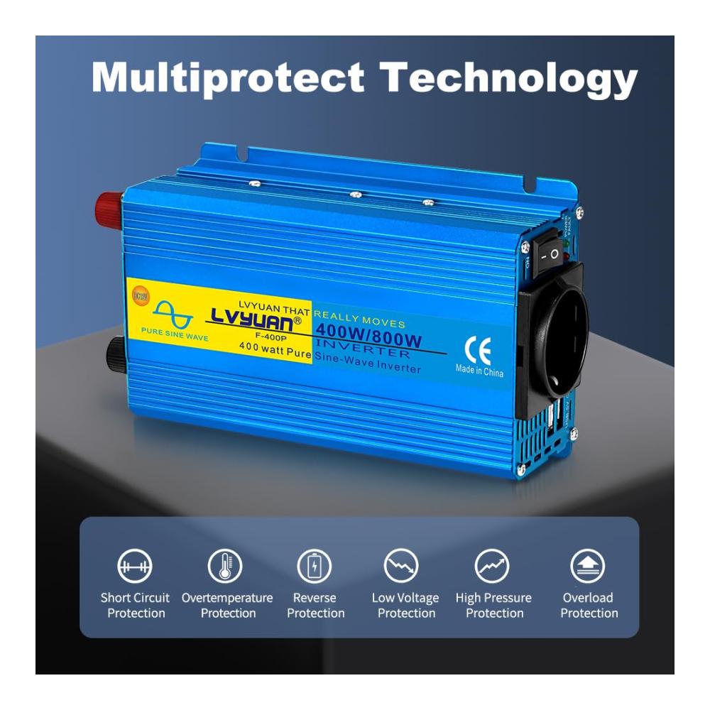 Hocheffizienter 400W/800W Reiner Sinus-Wechselrichter: Dieser Wechselrichter wandelt zuverlässig DC 12V in AC230V ± 5% um und liefert eine reine Sinuswelle mit einer Dauerleistung von 400W und einer Spitzenleistung von 800W.