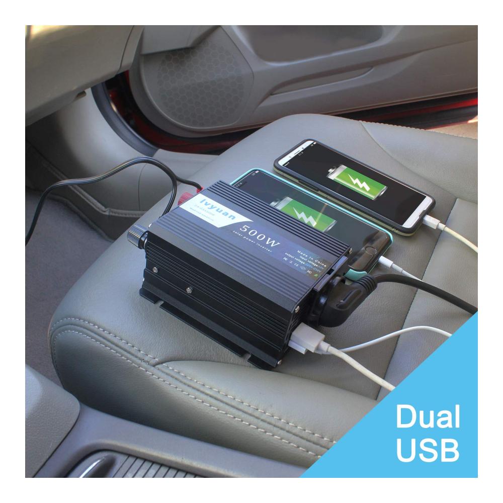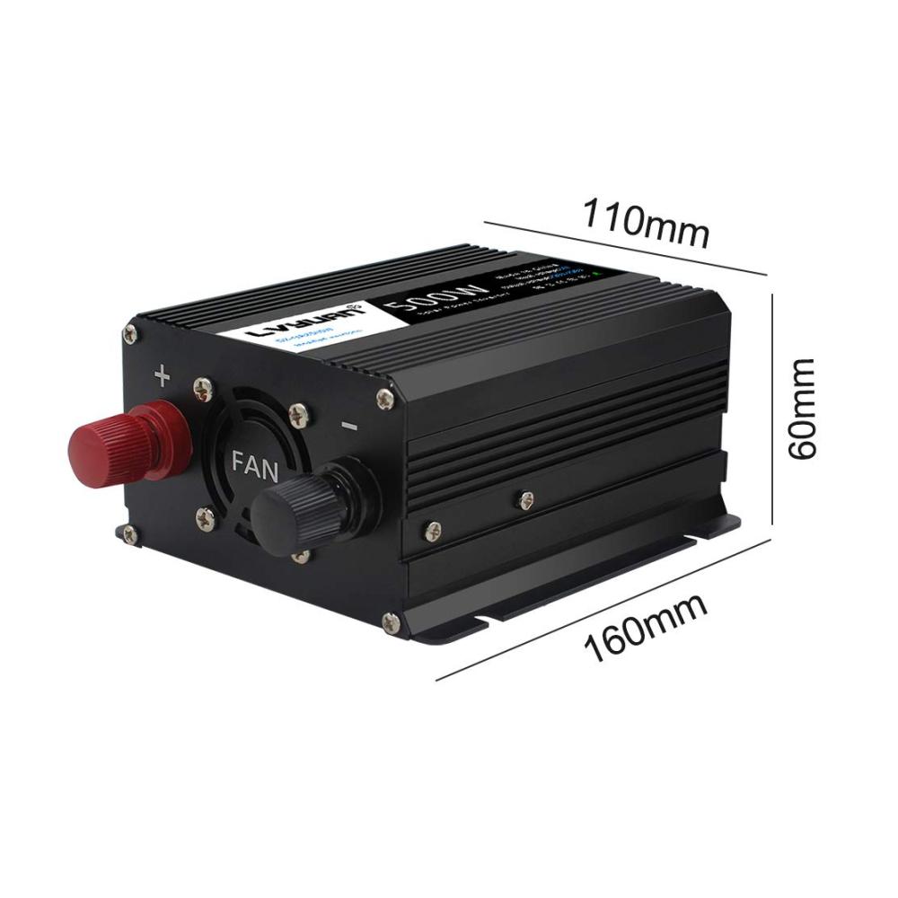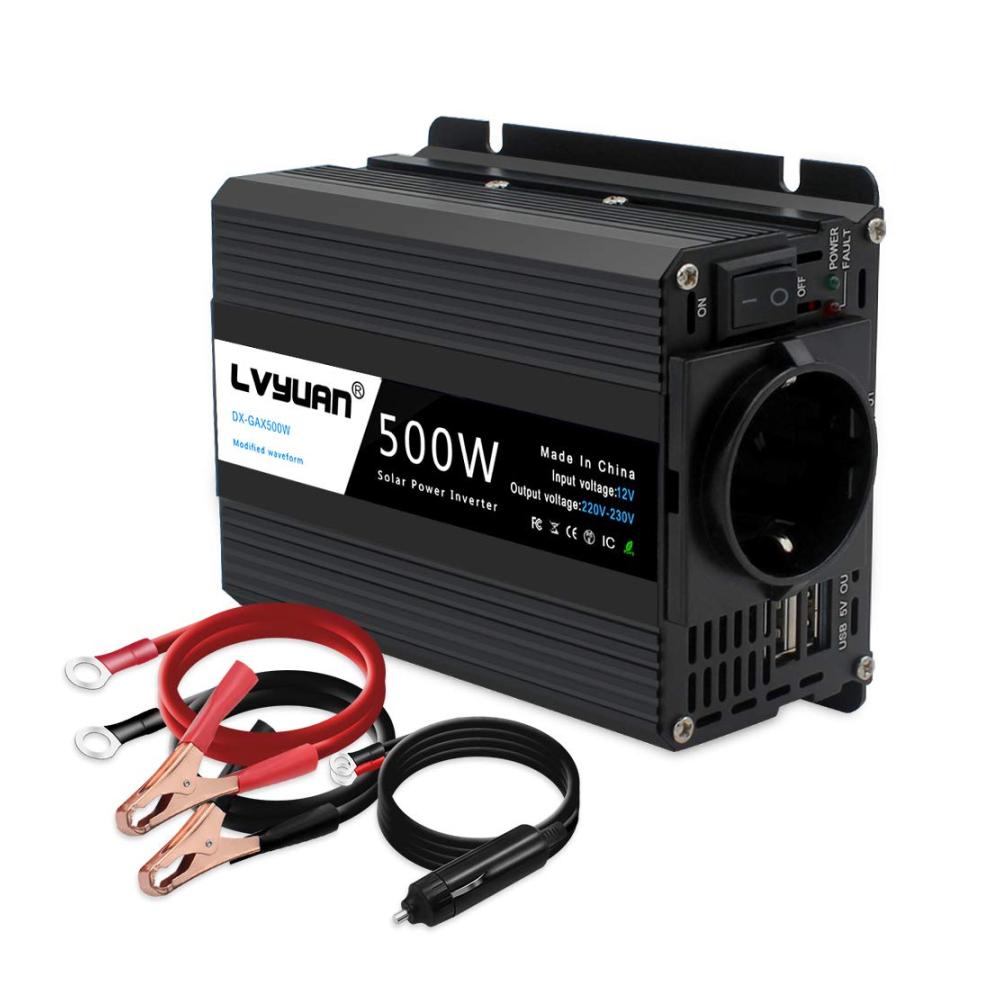 Mit dem 500W Wechselrichter von LVYUAN erhalten Sie eine leistungsstarke Lösung für unterwegs. Dieser Wechselrichter verwandelt 12V DC in 230V AC und bietet eine Spitzenleistung von 700 Watt. Dank einer EU-Steckdose und zwei USB-Anschlüssen können Sie mehrere Geräte gleichzeitig laden.