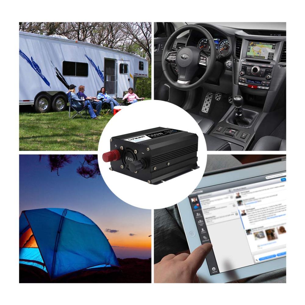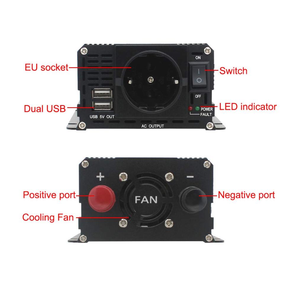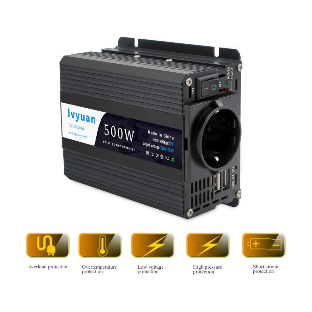 Ausgangsleistung: 500 W, Spitzenleistung: 700 W (< 10 ms), modifizierter Sinuswellen-Wechselrichter 12 V auf 230 V