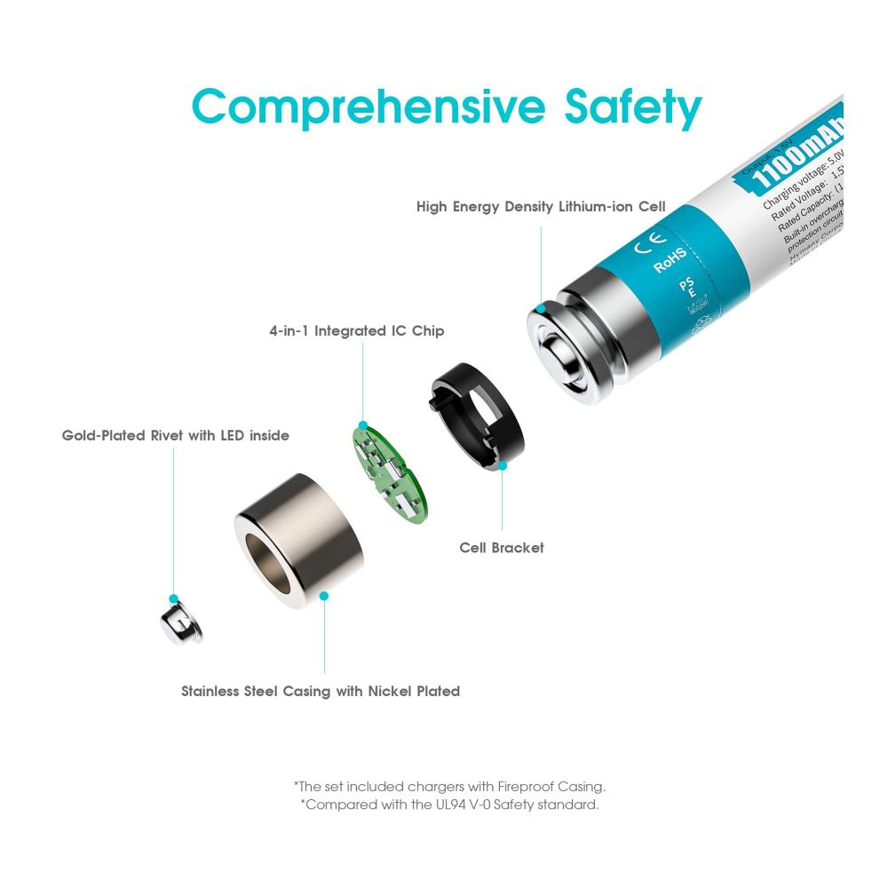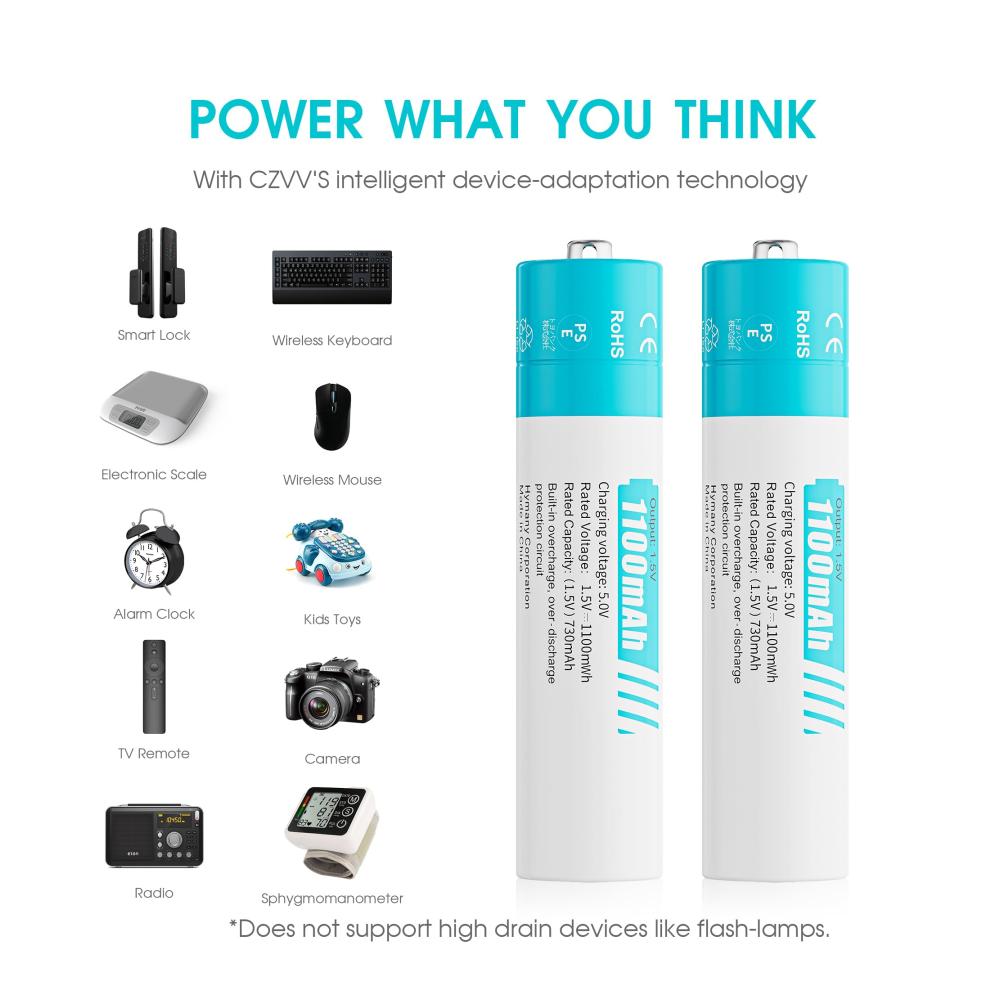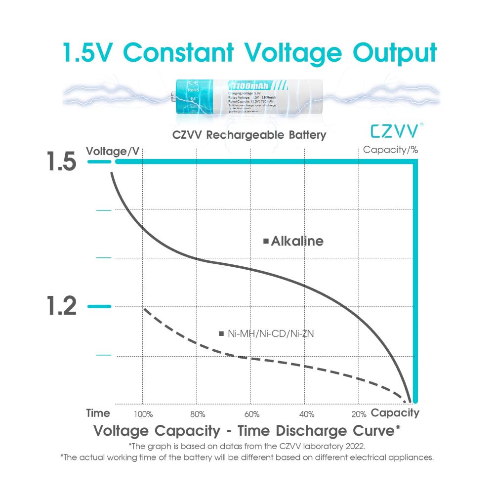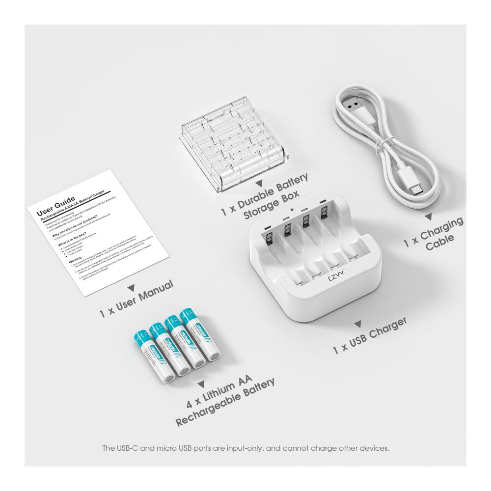 【Was Sie bekommen】 CZVVV Ultra 1100mWh 1.5V AAA Batterien (8-Pack), CZVVV Q022 Pro 4-bay individuelles tragbares 4-bay Ladegerät, Lightning Typ C Kabel, Handbuch, 12 Monate Garantie und Kundendienst.