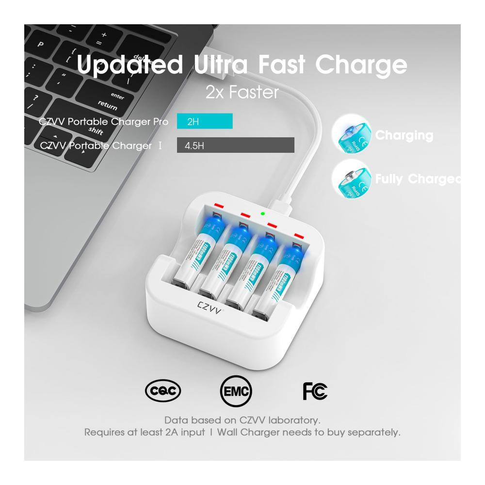 【Lade-Design aktualisiert】 Sind Sie es leid, während des Aufladens gelangweilt zu warten? Es hat ein aktualisiertes Ladegerät Design gemacht. 4 Kanäle für schnelles Laden zur gleichen Zeit. Erhebliche Reduzierung der Ladezeit um mindestens 44%. Reduzieren Sie den Abfall mit CZVVV Q022 Pro tragbares Ladegerät verwendet wird. Hinweis: Die Verwendung von nicht zugelassenen Ladegeräten kann zu Unfällen führen. Die Oberseite der AAA-Batterien blinkt geladen.