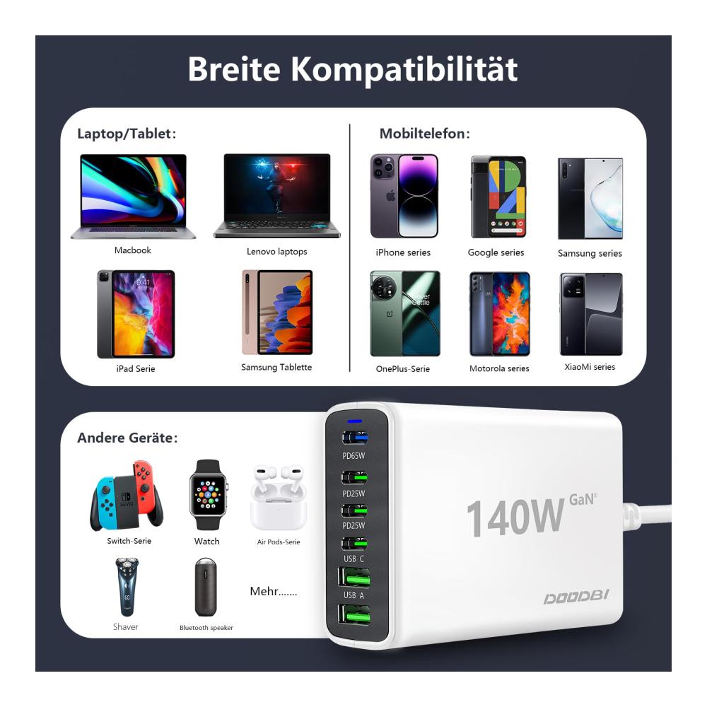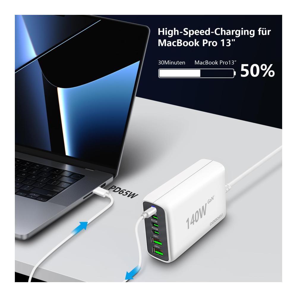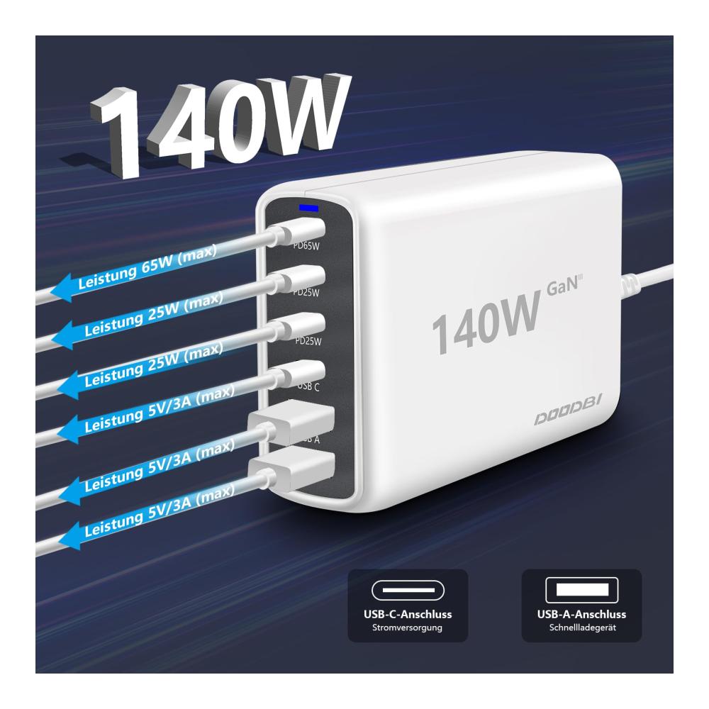 • 【DOODBI Service】140W USB C Ladegerät;1,5 x Meter langes abnehmbares Netzkabel;Benutzerhandbuch;1xJahr sorgenfreie Garantie.Lösen Sie Ihr Problem innerhalb von 24-Stunden.