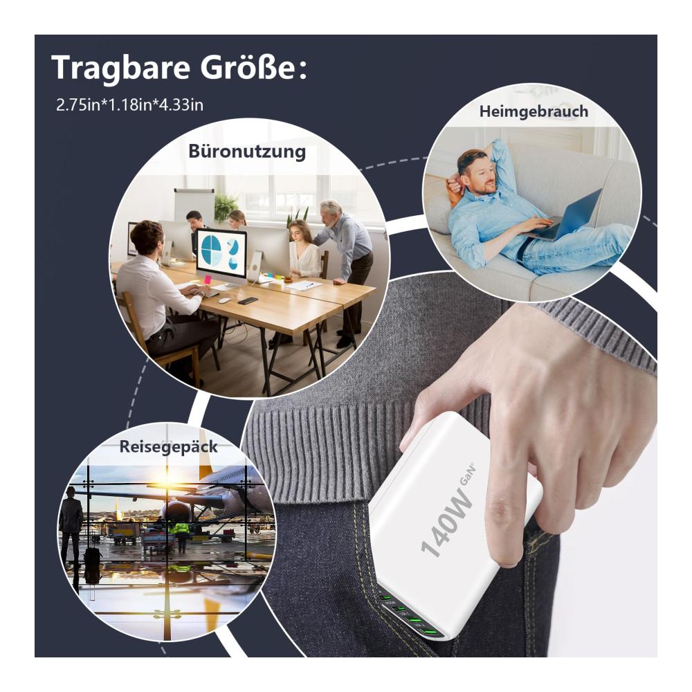 • 【140W USB C Ladegerät】Upgrade Single Port 65W USB C Ladegerät für Laptop/Macbook.Other Ports 2 PD 25W USB-C Port und 1 QC 15W USB-C Port; 2 USB-A Anschlüsse. Tragbarer Entwurf 6 und 1, können Sie Ihr Telefon und ipad etc. gleichzeitig aufladen. Reduzieren Sie das Gewicht von Geschäfts und Reisetaschen für ein entspannteres Büro und Urlaubserlebnis.