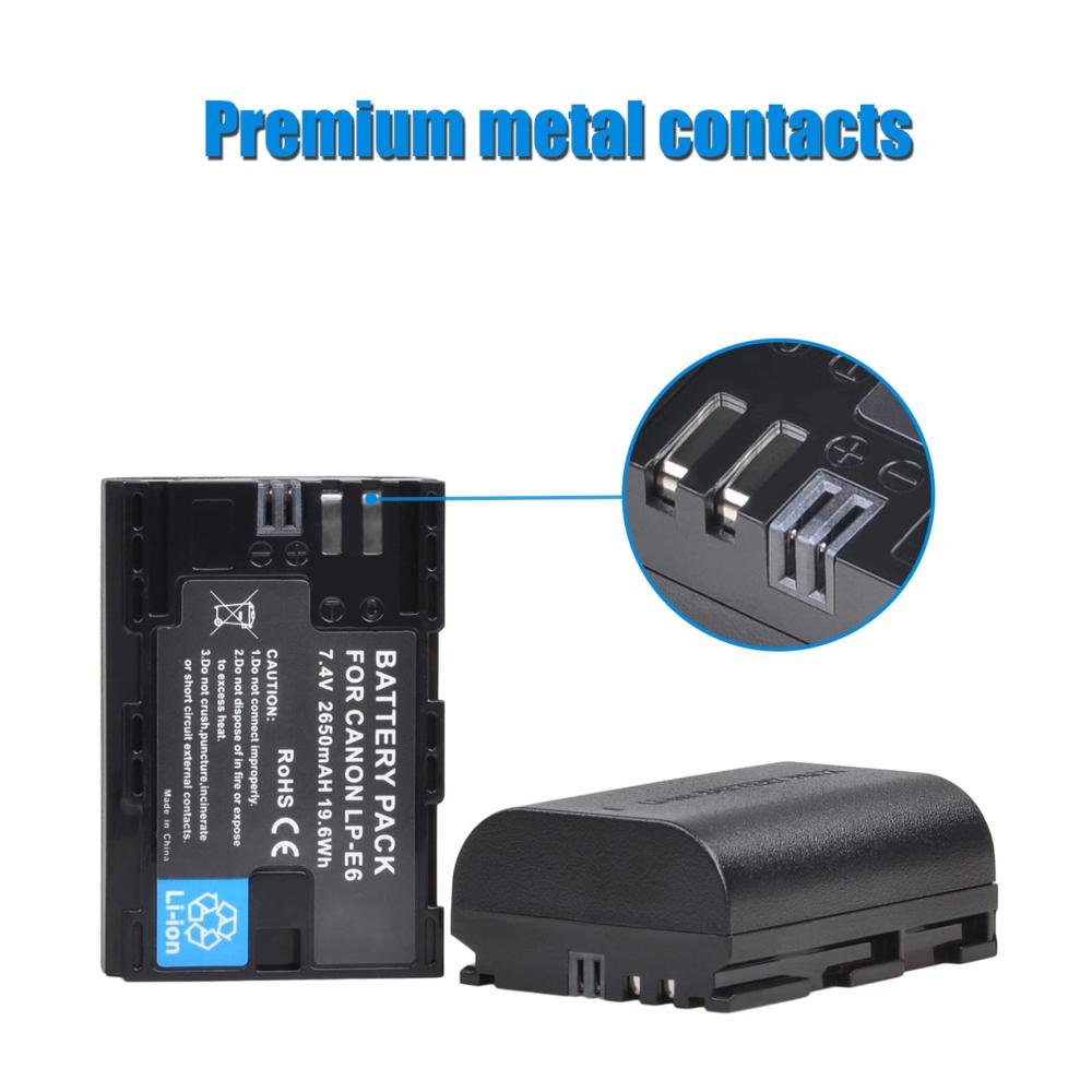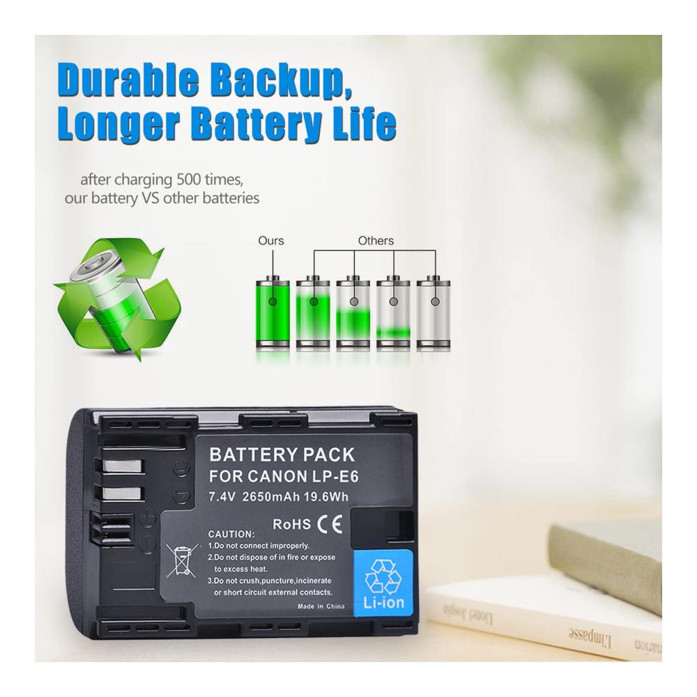 Dieses Set enthält 2x 2650mAh LP-E6/LP-E6N Akkus und ein LCD-USB-Ladegerät. Die Akkus bieten eine lange Lebensdauer und ermöglichen eine Vielzahl von Aufnahmen pro Ladung.
