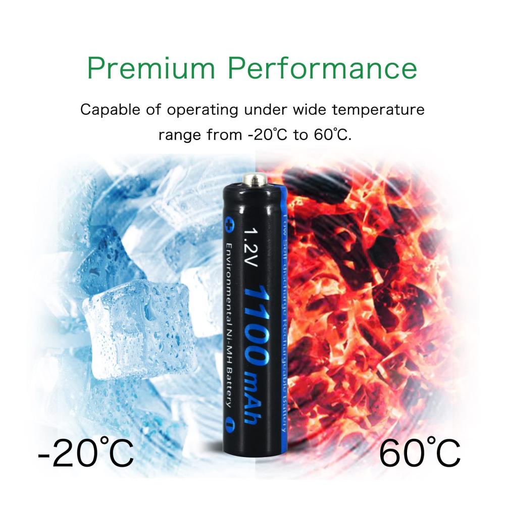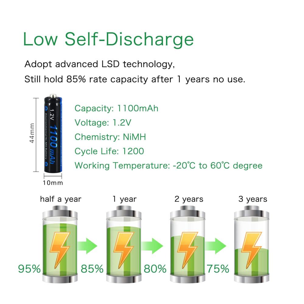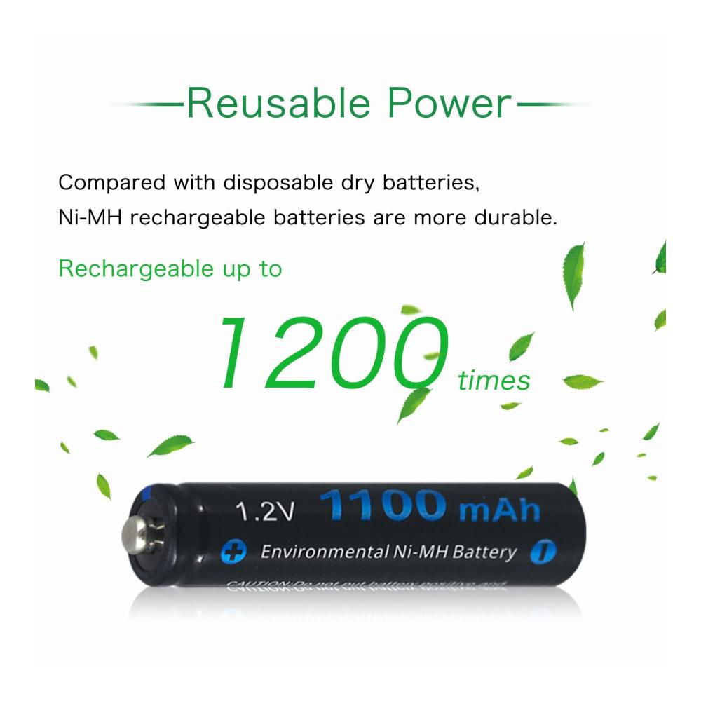 Umweltfreundlich. Ni-MH-Umweltschutzmaterial reduziert die Schwermetallverschmutzung, leckfrei und auslaufsicher, bis zu 1200 Mal wiederverwendbar