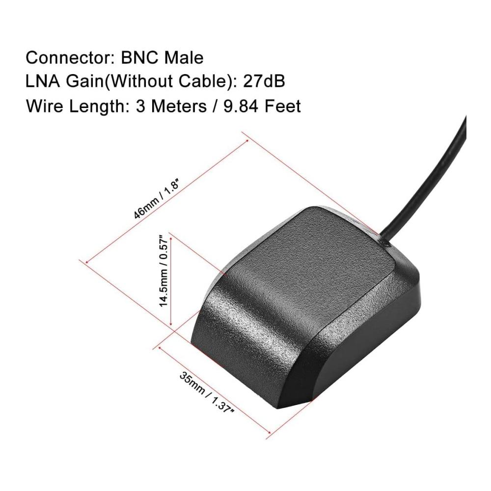 Anschluss: BNC-Stecker; Spannung: 3-5V; Länge: 3 Meter / 9,84 Fuß; -Gewinn (ohne Kabel): 27dB; Mittenfrequenz: 1575,42 MHz