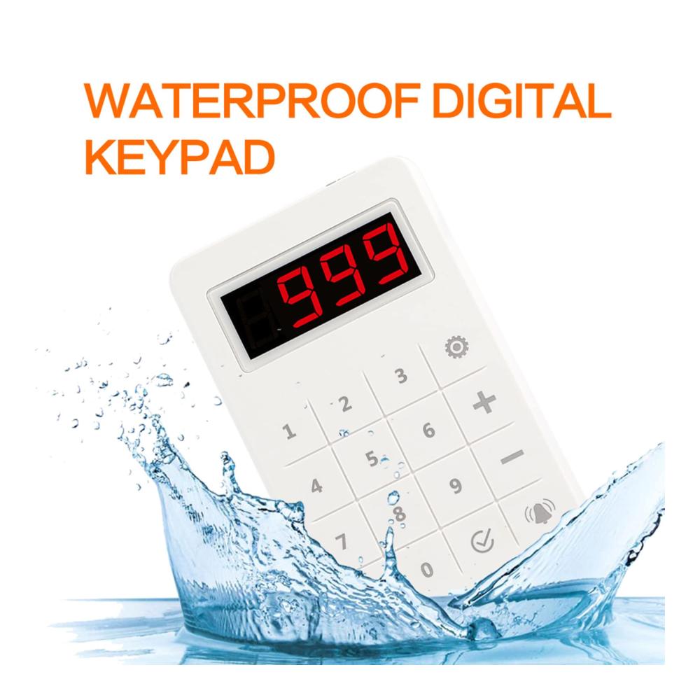 【WASSERDICHT UND STURZSICHER】 Mit einem wasserdichten und ölbeständigen Touchpad ist das Paging-System ideal für Restaurants, Cafés, Imbisswagen und andere Umgebungen, in denen es häufig zu versehentlichen Wasserlecks kommt. Es kann auch in Kliniken, Krankenhäusern, Kirchen, Bibliotheken, Garagen usw. verwendet werden.