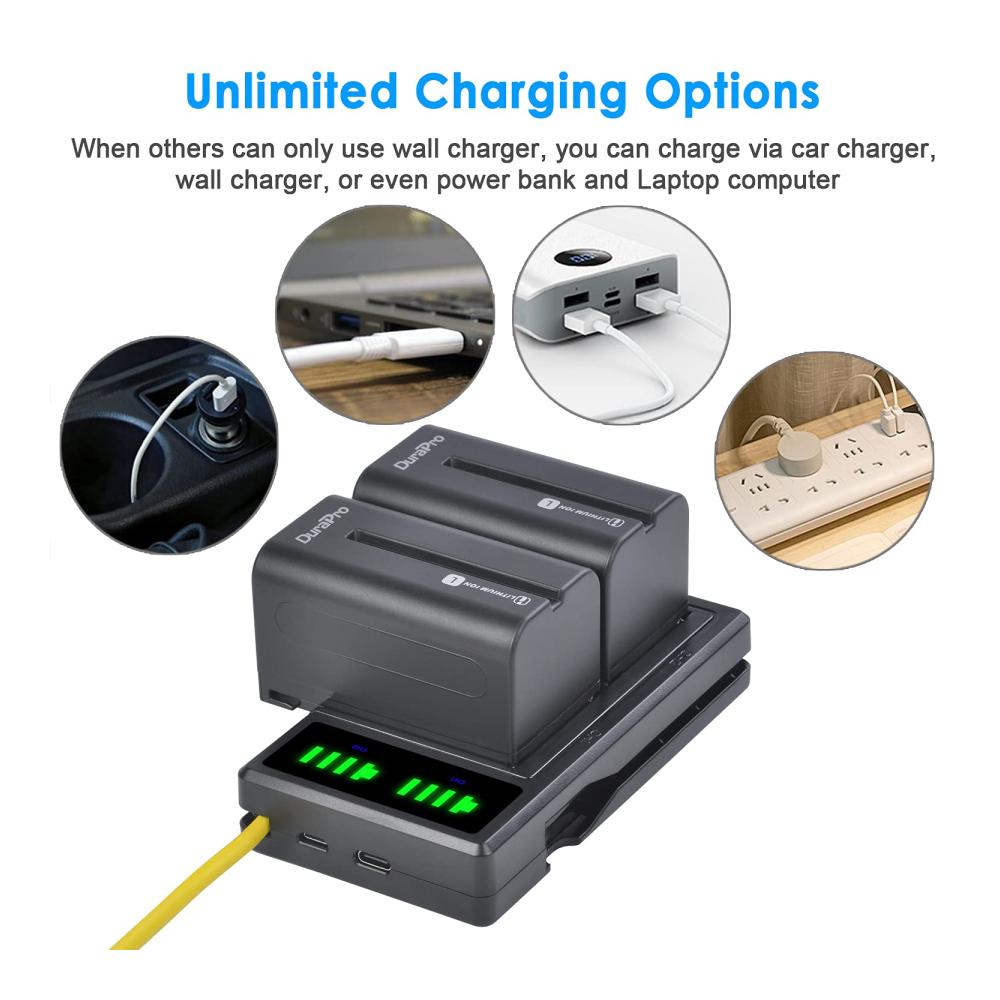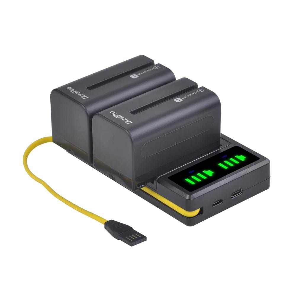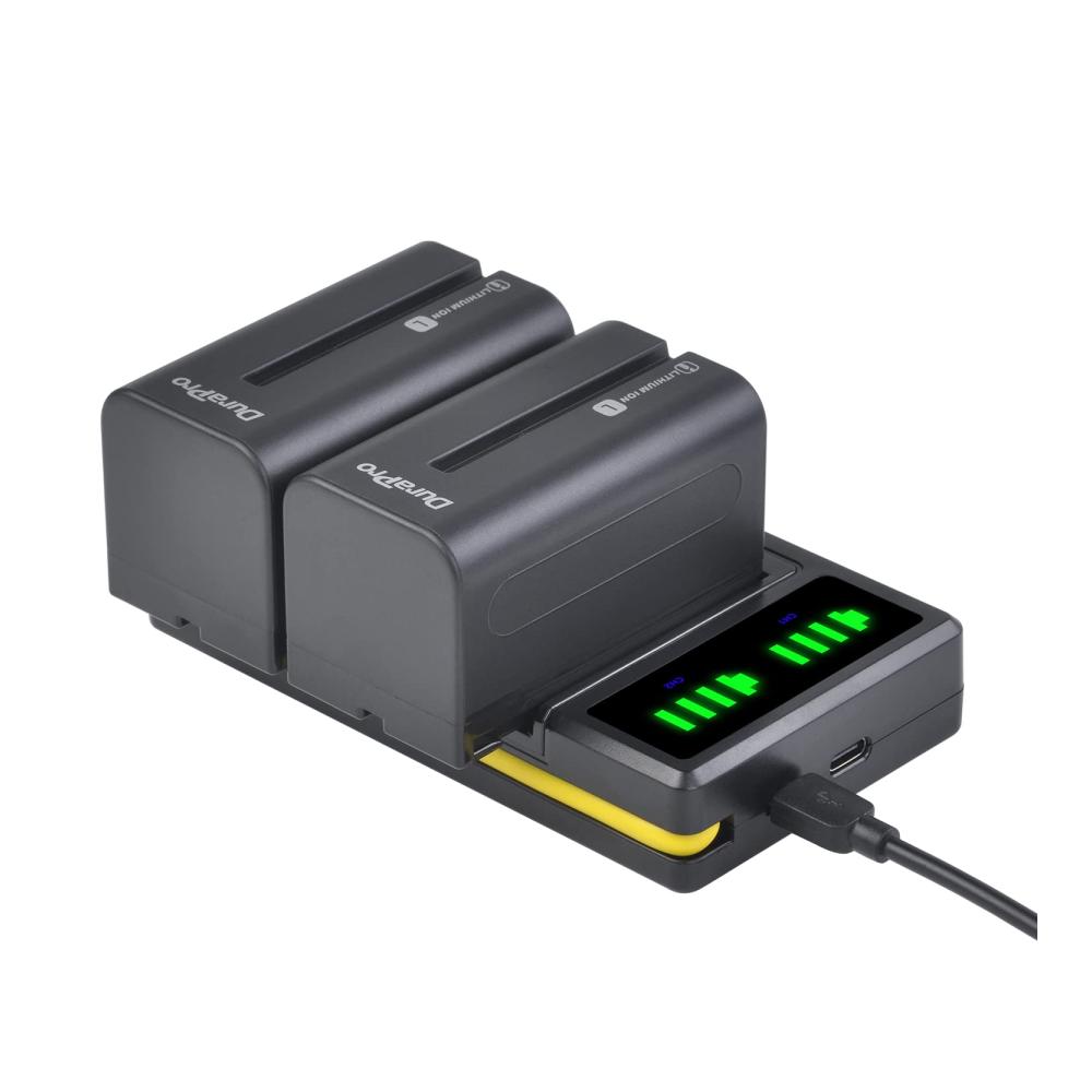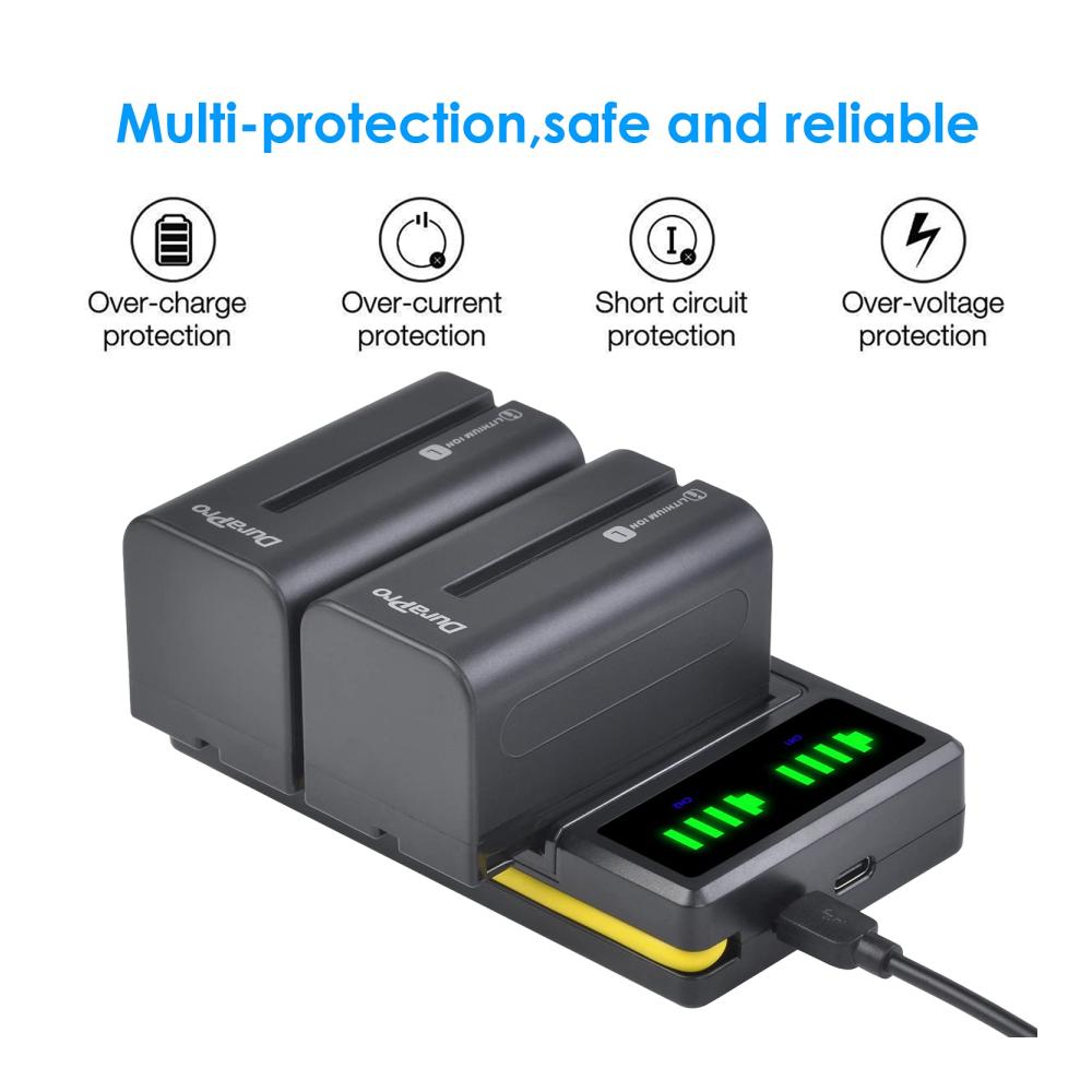 Erhalten Sie zuverlässige Leistung für Ihre Sony Camcorder mit dem NP-F750 NP-770 Akku und dem LCD-USB-Ladegerät von DuraPro. Dieses Set umfasst 2 Lithium-Ionen-Batterien und ein Dual-USB-Ladegerät mit Typ-C-Anschluss.