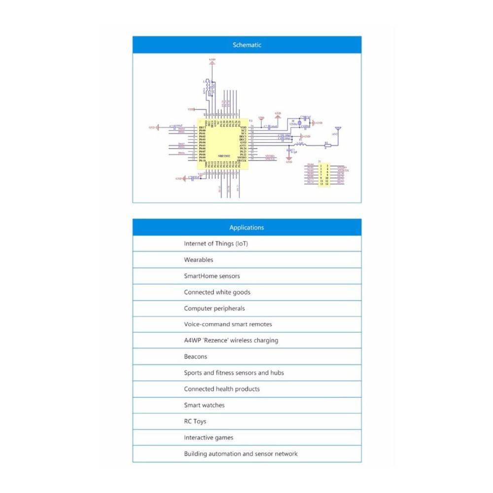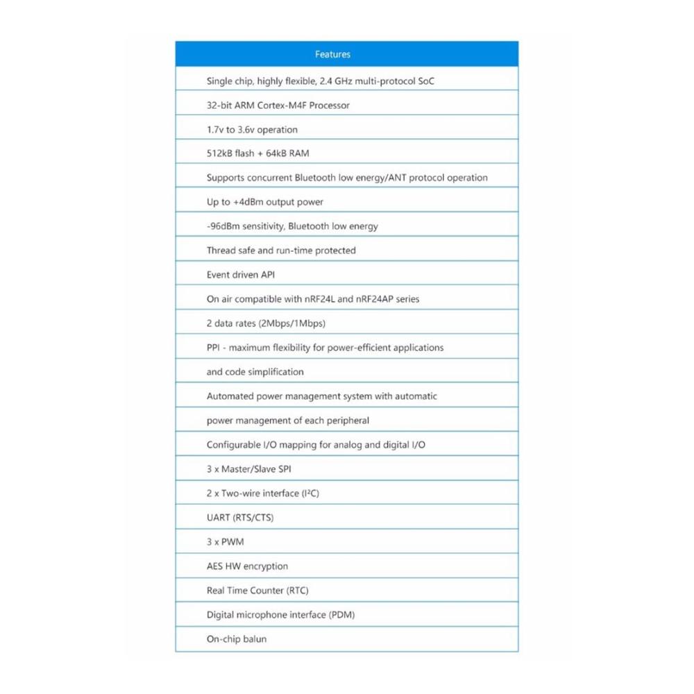 Das SoC nRF52832 basiert auf einer 32-Bit-ARM–M4F-CPU mit 512 KB 64 KB RAM. Der eingebettete 2,4-GHz-Transceiver unterstützt Bluetooth Low Energy, ANT und den proprietären 2,4-GHz-Protokollstapel.