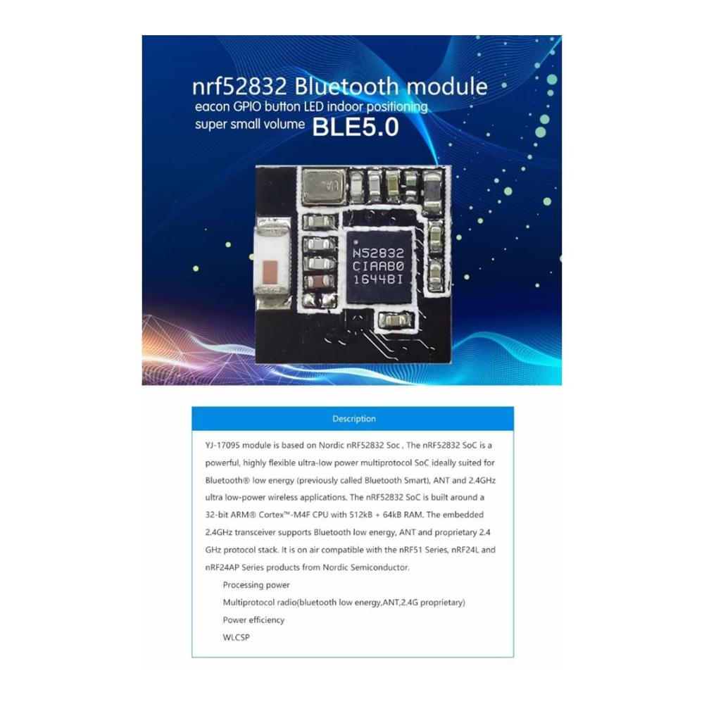 GYSURYB RechenleistungMultiprotokoll-Radio (Bluetooth Low Energy, ANT, proprietäres 2.4G)LeistungseffizienzWLCSPHardwaremodul :SWD-Programmierer (SWDIO, SWCLK, , GND)nRF52832 WLCSPGröße: 9,4 x 9,25 mmBLE-Stack und RF 2,4 GHzTyp: Bluetooth-ModulFarbe: SchwarzMaterial: PCBGröße: 9,4 x 9,25 x 2 mmPackungsinhalt:1 x Bluetooth-ModulNur der oben genannte Paketinhalt, andere Produkte sind nicht enthalten.Hinweis: Wegen der Lichtreflexion und Bildschirme könnte der Farbeton in den Fotos sowie des tatsächlichen Produkts etwas unterschiedlich sein. Der erlaubte Messfehler ist /- 1-3 cm.