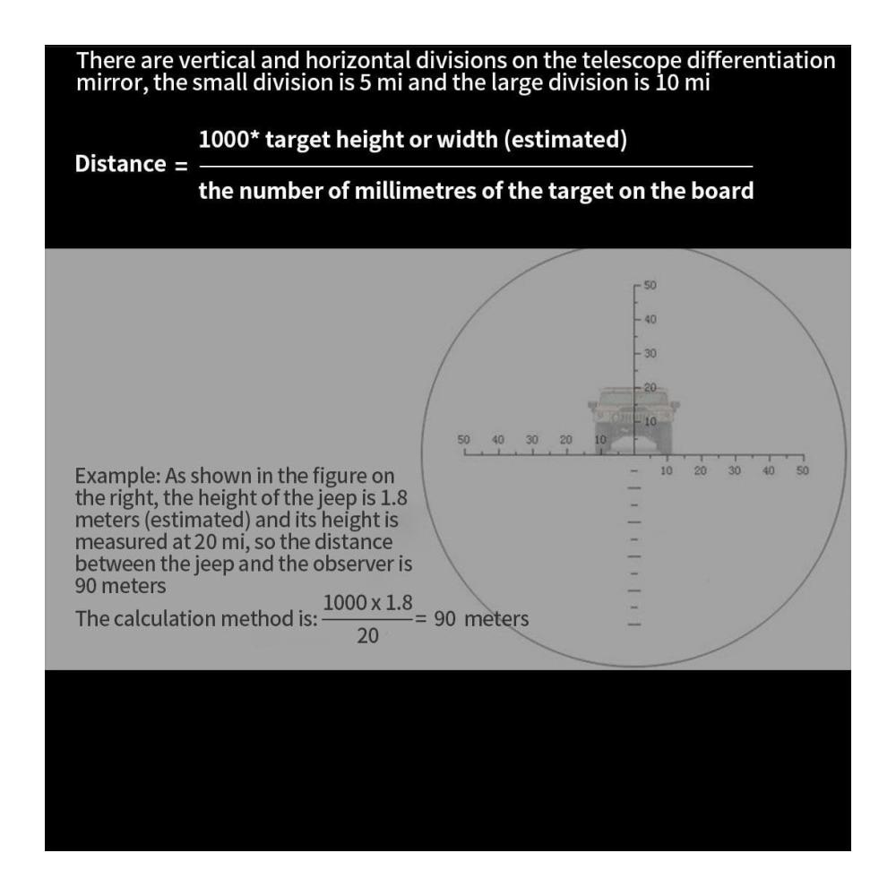 Das Teleskop verfügt im Inneren über Markierungen zur groben Messung der Entfernung und Ausrichtung des Ziels: Das Fadenkreuz auf dem Teilerspiegel verfügt über vertikale Unterteilungen, horizontale Unterteilungen und Entfernungsunterteilungen. Jeder kleine Teil der horizontalen und vertikalen Teilung entspricht 5 mil und jeder große Teil entspricht 10 mil.
