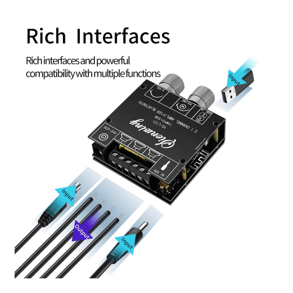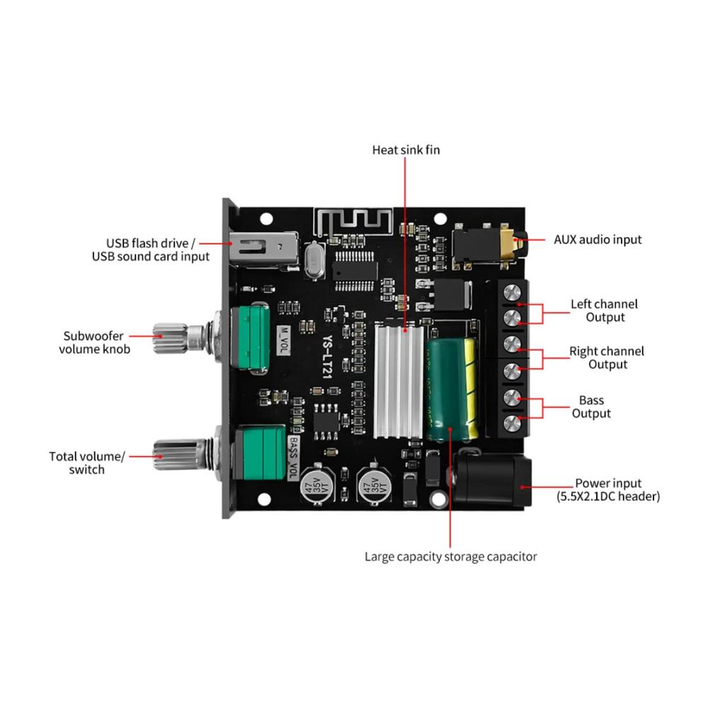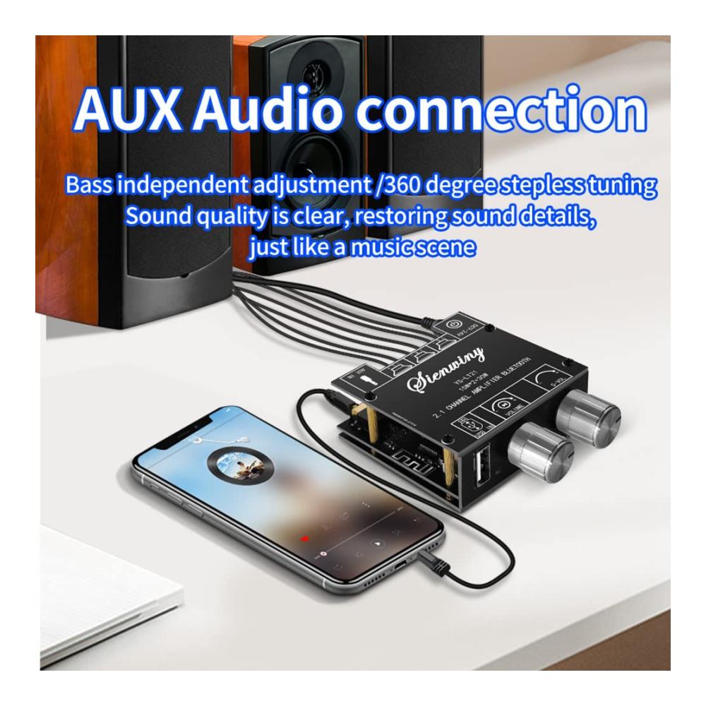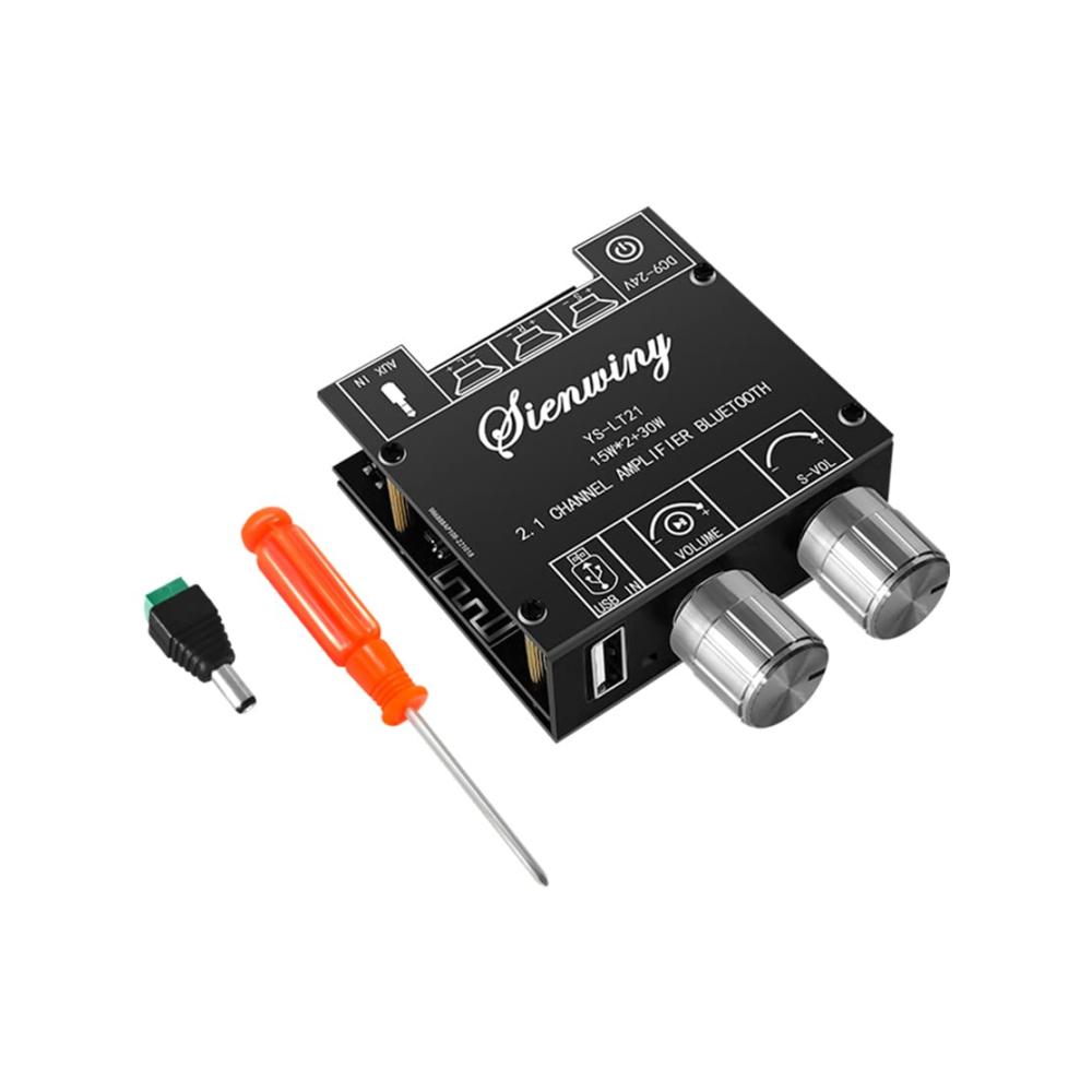 Entdecken Sie die Vielseitigkeit des -LT21 2.1-Kanal-Bluetooth-Verstärkerplatine 15 W 15 W 30 W mit Subwoofer-Knopf Codier Audio-Modul DC9-24 V. Dieses Produkt bietet eine breite Palette an Funktionen und Anpassungsmöglichkeiten für Ihr Hifi-Verstärker-Erlebnis. In elegantem Schwarz gehalten, unterstützt es verschiedene Eingangsmodi wie Bluetooth, AUX und USB, um Ihren Bedürfnissen gerecht zu werden. Die Stromversorgung erfolgt über DC9-24V/3A für eine kraftvolle Leistung. Mit adaptivem Lautsprecherdesign und einem breiten Spektrum an Schutzmechanismen ist dieser Verstärker die perfekte Ergänzung für Ihr Audio-Setup. Maßgeschneiderte Lautstärkeregelung und spezielle Funktionen wie die Unterstützung der Audio-App-Steuerung bieten ein optimales Klangerlebnis. Komplett mit allem Zubehör, was Sie benötigen, ist dieser Verstärker bereit, Ihr Hörerlebnis auf die nächste Stufe zu heben.