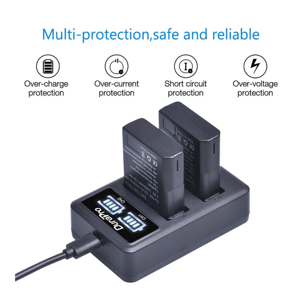 Das Paket enthält 2 EN-EL14 Batterien sowie ein DuraPro LED-Dual-USB-Ladegerät und ein Micro-USB-Kabel für bequemes Aufladen unterwegs. Mit einer Spannung von 7,4 Volt sind diese Batterien ideal für längere Fotosessions.