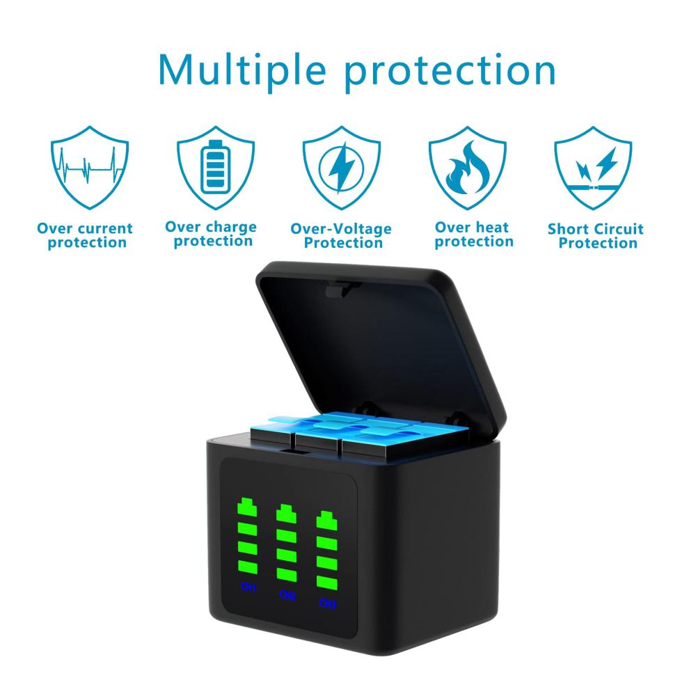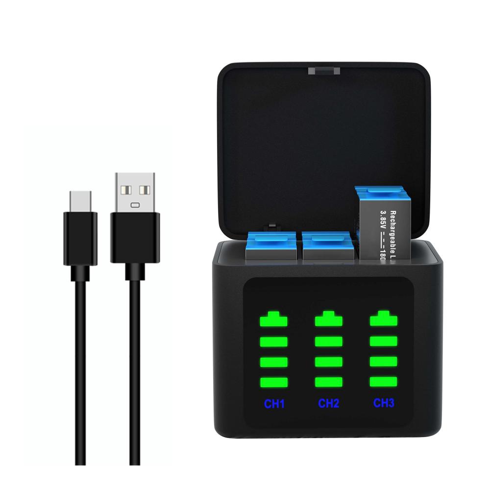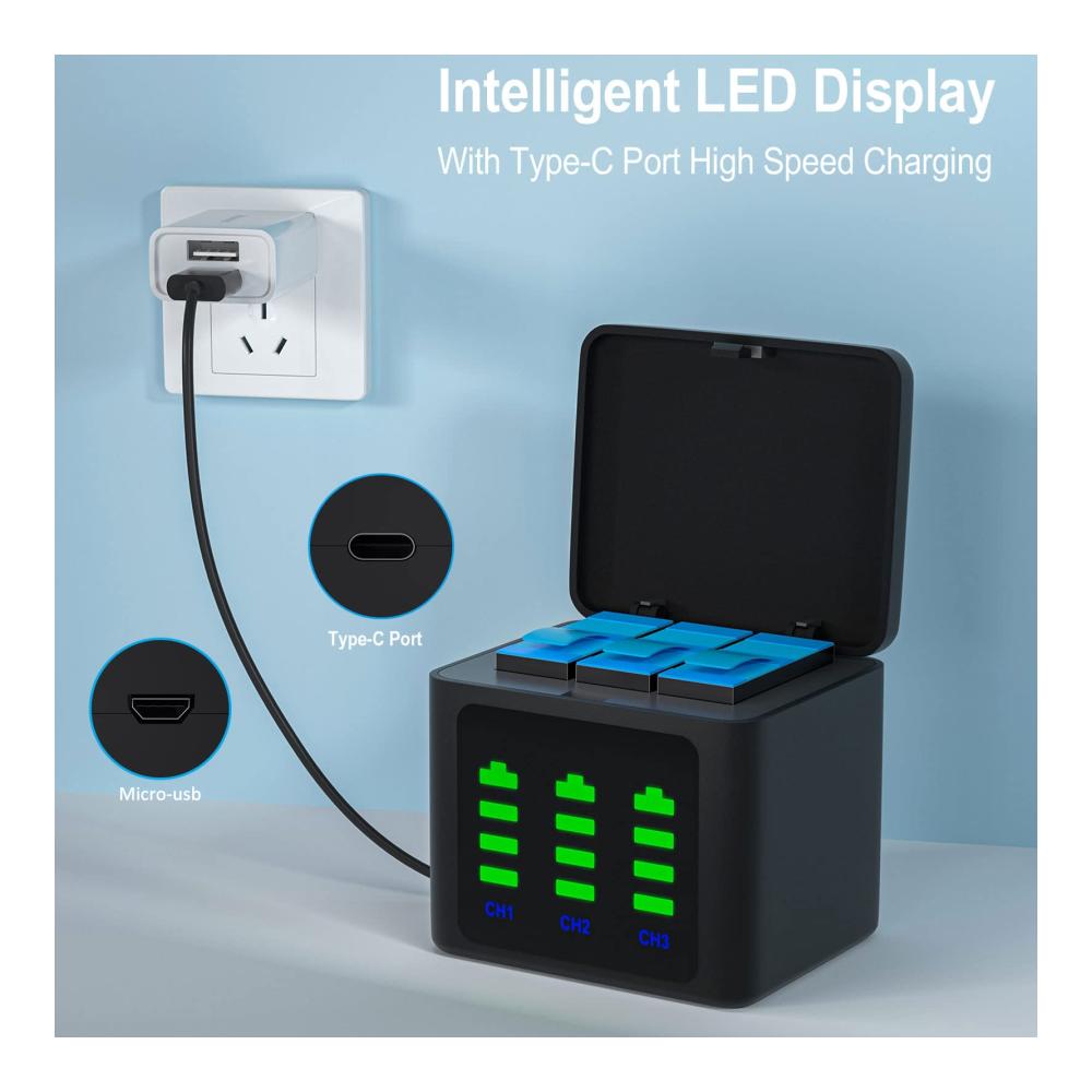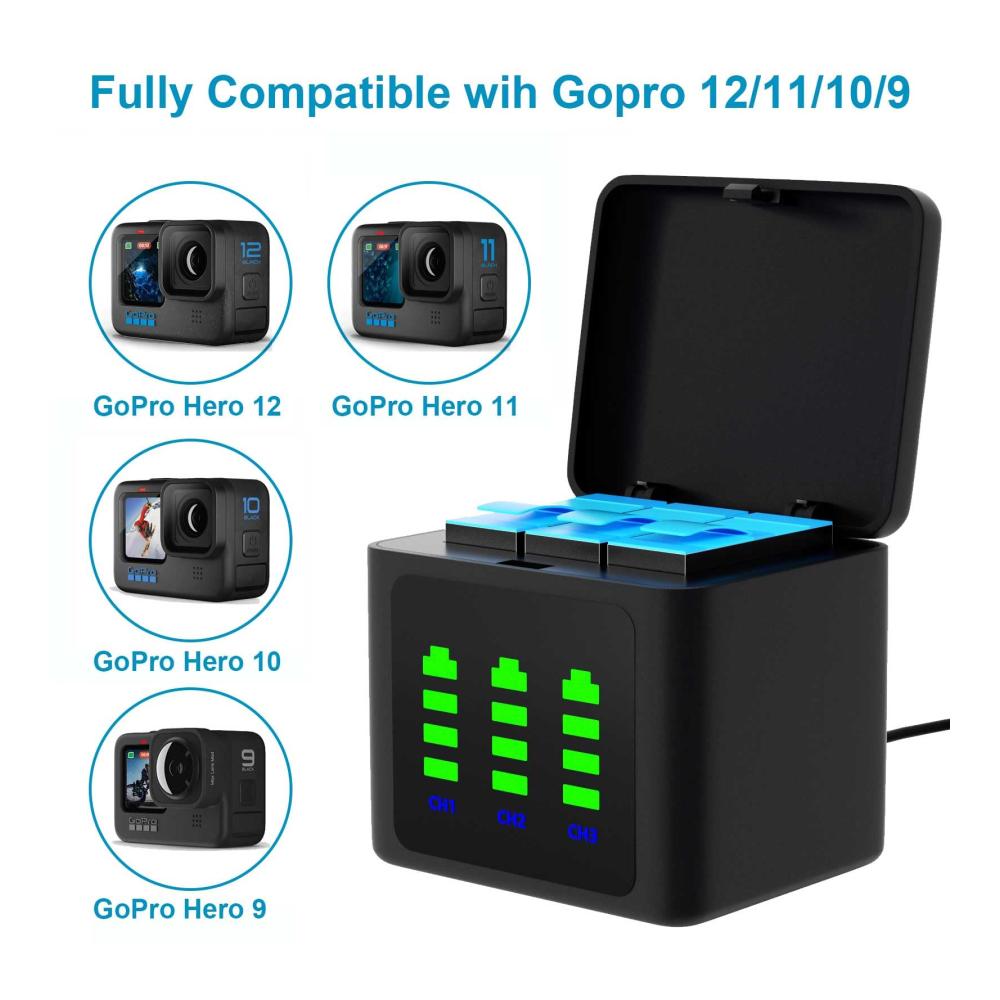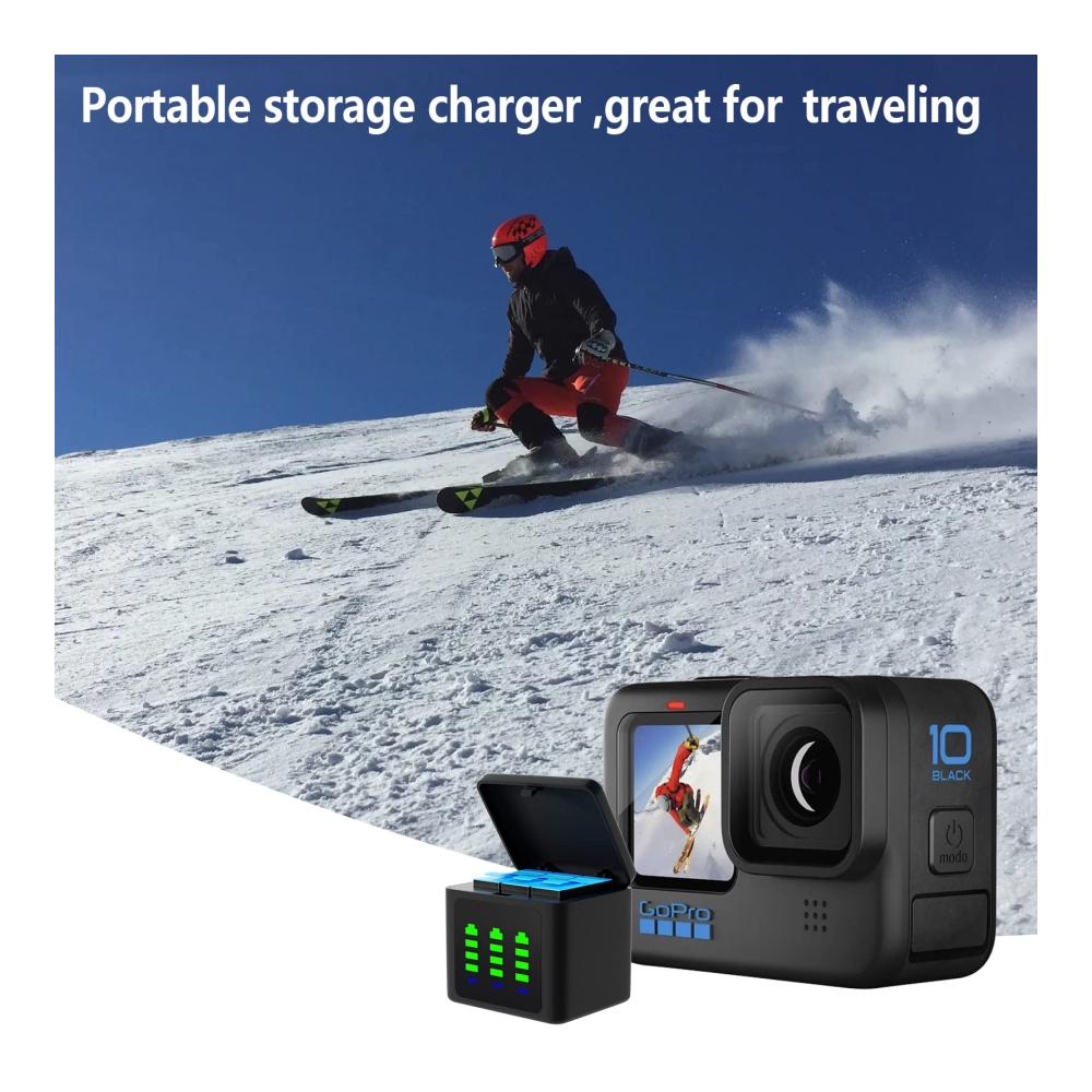 Hisewen präsentiert das Akku Ladegerät für Gopro Hero 12/11/10/9 mit 3 Steckplätzen und Typ-C Port – inklusive praktischer Aufbewahrungsbox für Ihre Kamera-Akkus.