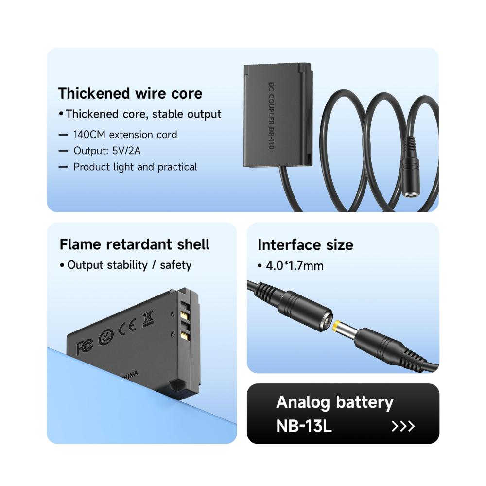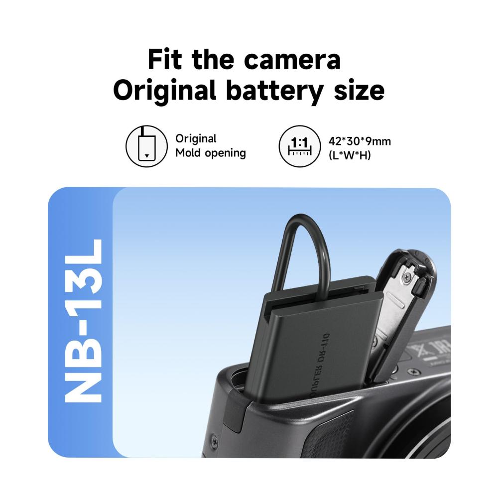 Unser NB-13L Dummy Akku Kit mit AC-Netzteiladapter bietet breite Kompatibilität für verschiedene Canon Kameras, einschließlich Canon SX740, G1 X Mark III und mehr. Achten Sie darauf, die Batterieabdeckung vollständig zu schließen, um Fehlfunktionen des Geräts zu vermeiden.