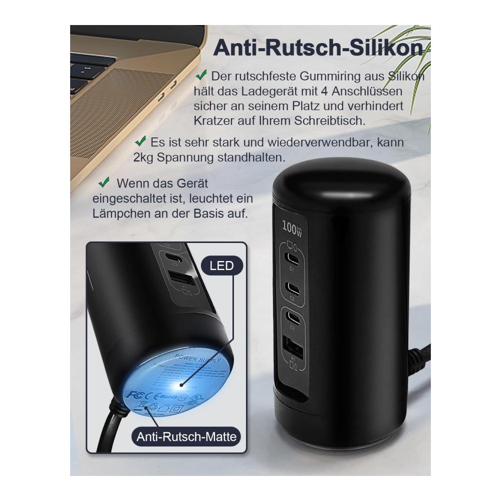 Laden Sie Ihre Geräte schnell und effizient auf: Diese 100W USB-C Ladestation bietet universelle Kompatibilität und Smart Identification Technologie für MacBook Pro/Air, USB-C Laptop, iPhone 14/13/12, Galaxy Fold, Pixel und mehr. Mit drei USB-C-Anschlüssen und einem USB-A-Anschluss ist sie ideal für verschiedene Geräte. Die Ladestation verfügt über einen intelligenten Chip zum Schutz vor Überhitzung, Überladung, Kurzschluss und Überstrom. Dank des platzsparenden Designs und der rutschfesten Silikonbasis ist sie praktisch und sicher. Die elegante blaue LED-Anzeige rundet das Design ab.