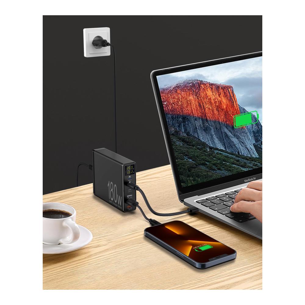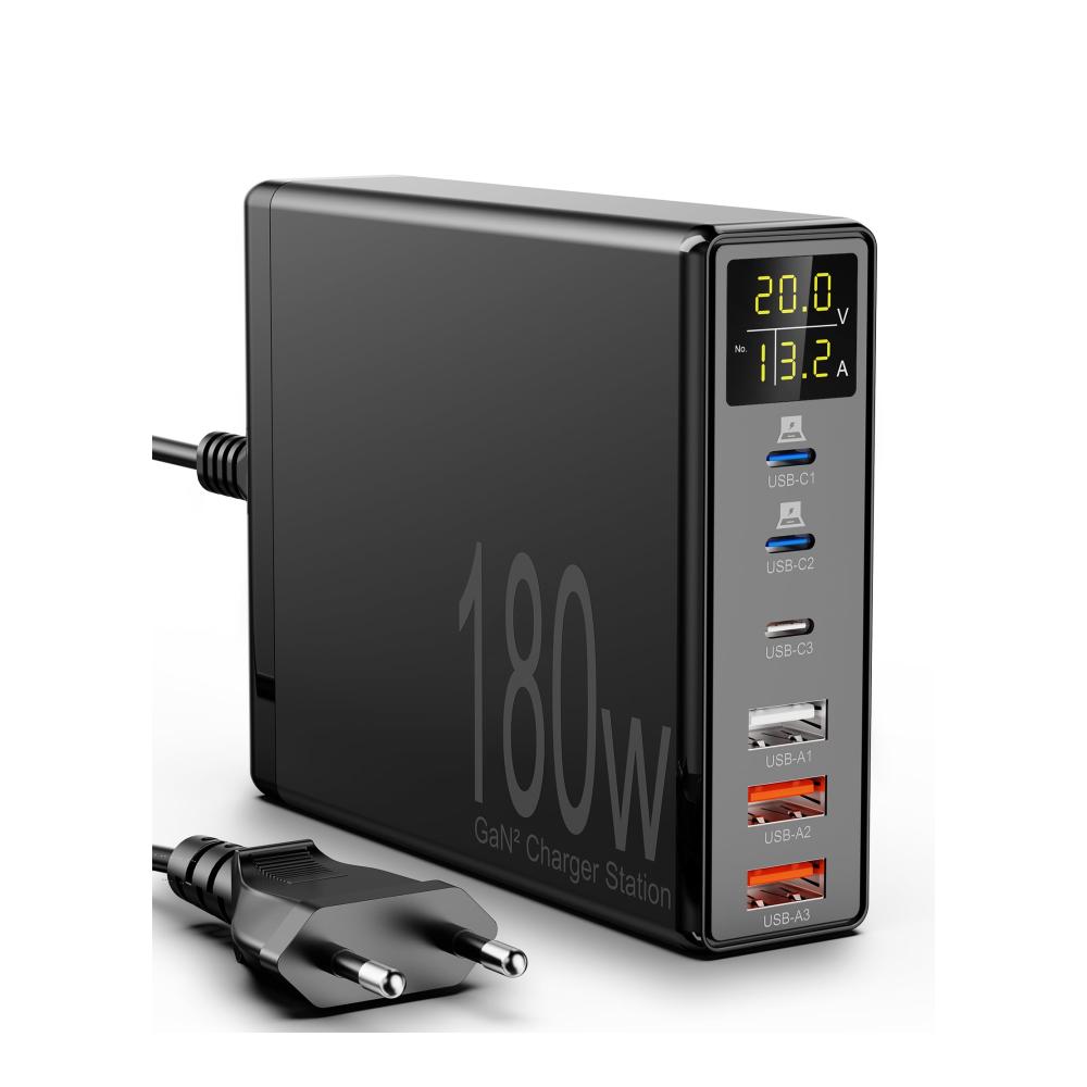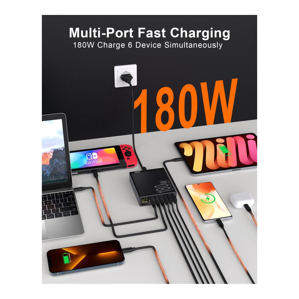 【180W USB Ladestation Mehrfach】Erleben Sie die Kraft unserer USB Ladestation, die beeindruckende 180W Leistung liefert. Mit 3 USB-A-Anschlüssen und 3 USB-C-Anschlüssen sind Sie bestens ausgestattet. Hervorzuheben ist das integrierte LED-Display zur Echtzeitüberwachung des Ladezustands jedes Anschlusses. Bei Verwendung des USB-C1-Anschlusses allein erwartet Sie eine rasante 65W Ultrabeschleunigung, die Ihren 13-Zoll MacBook Air in nur 1,5 Stunden auf 100% auflädt.