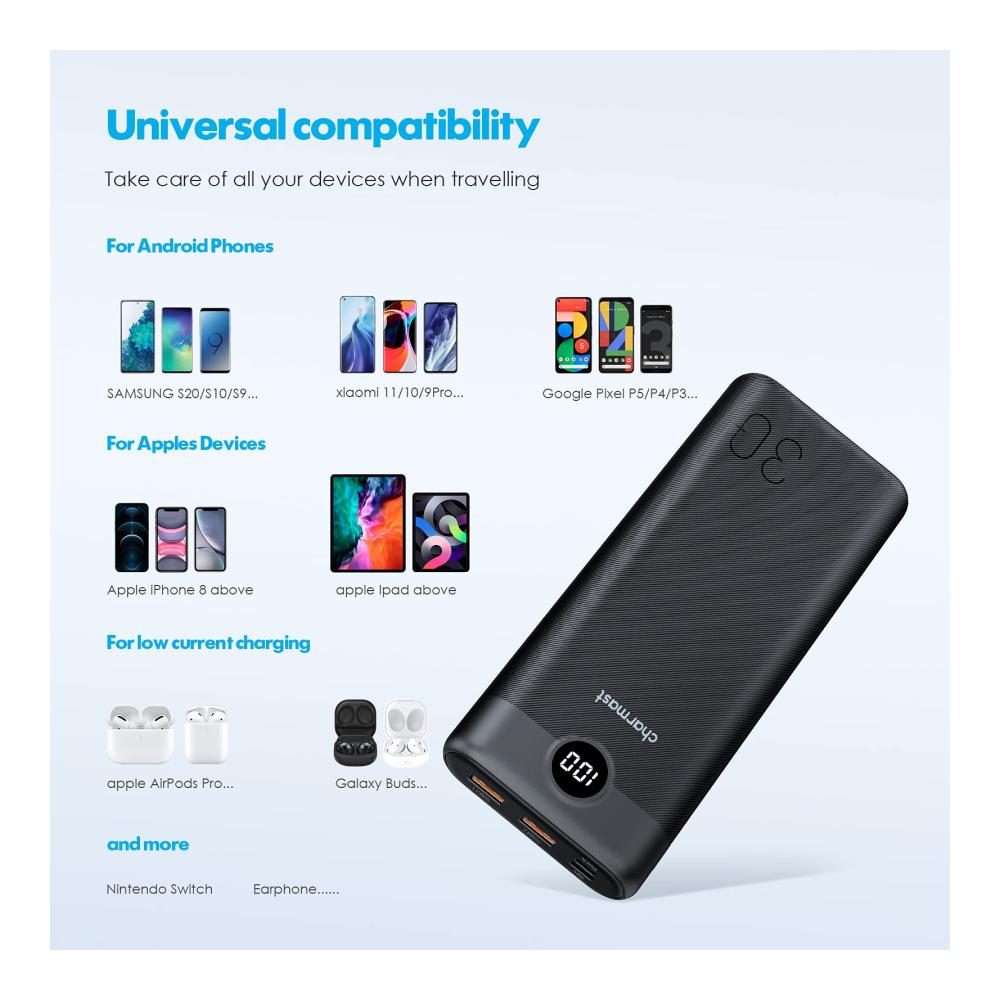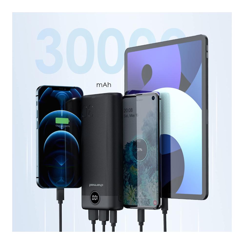 Die Powerbank 30000 mAh von Charmast ist eine leistungsstarke externe Batterie mit 30000 mAh Kapazität und 20 W PD QC 3.0 für schnelles Aufladen. Mit einem Micro-USB-Steckverbinder und einer eleganten schwarzen Farbe ist sie ideal für unterwegs. Entdecken Sie die Welt von Charmast, einem Branchenführer in der Powerbank-Technologie, der hochwertige Produkte für das wertvollste Ladeerlebnis bietet.