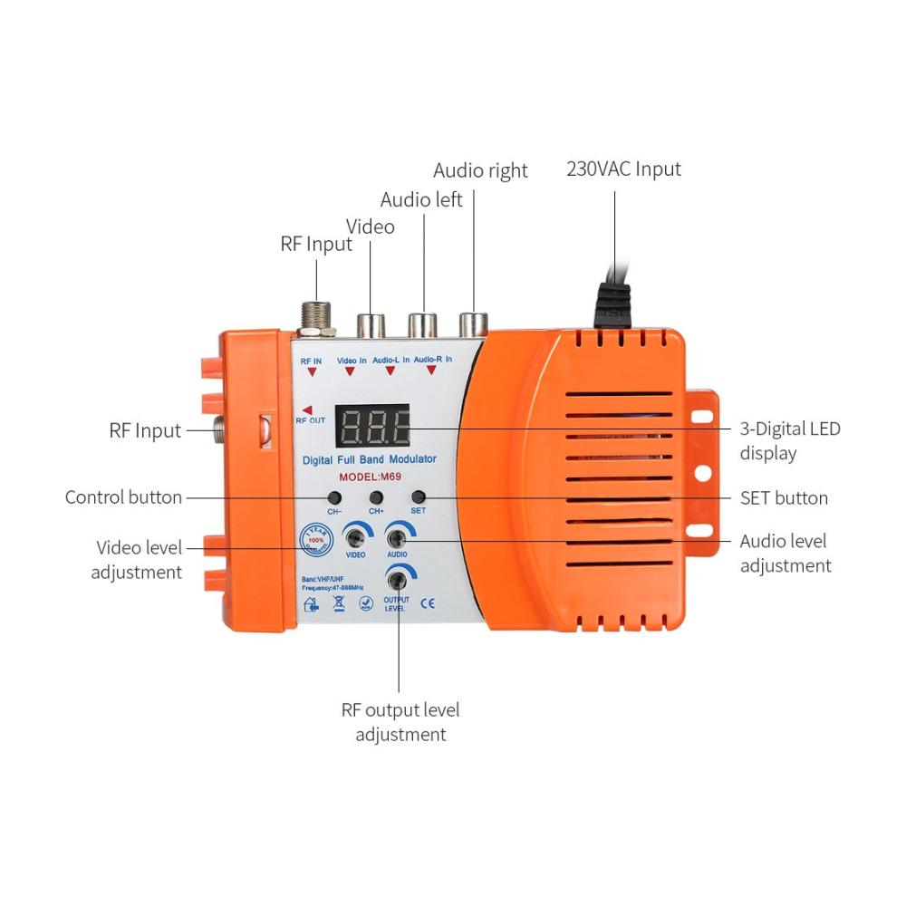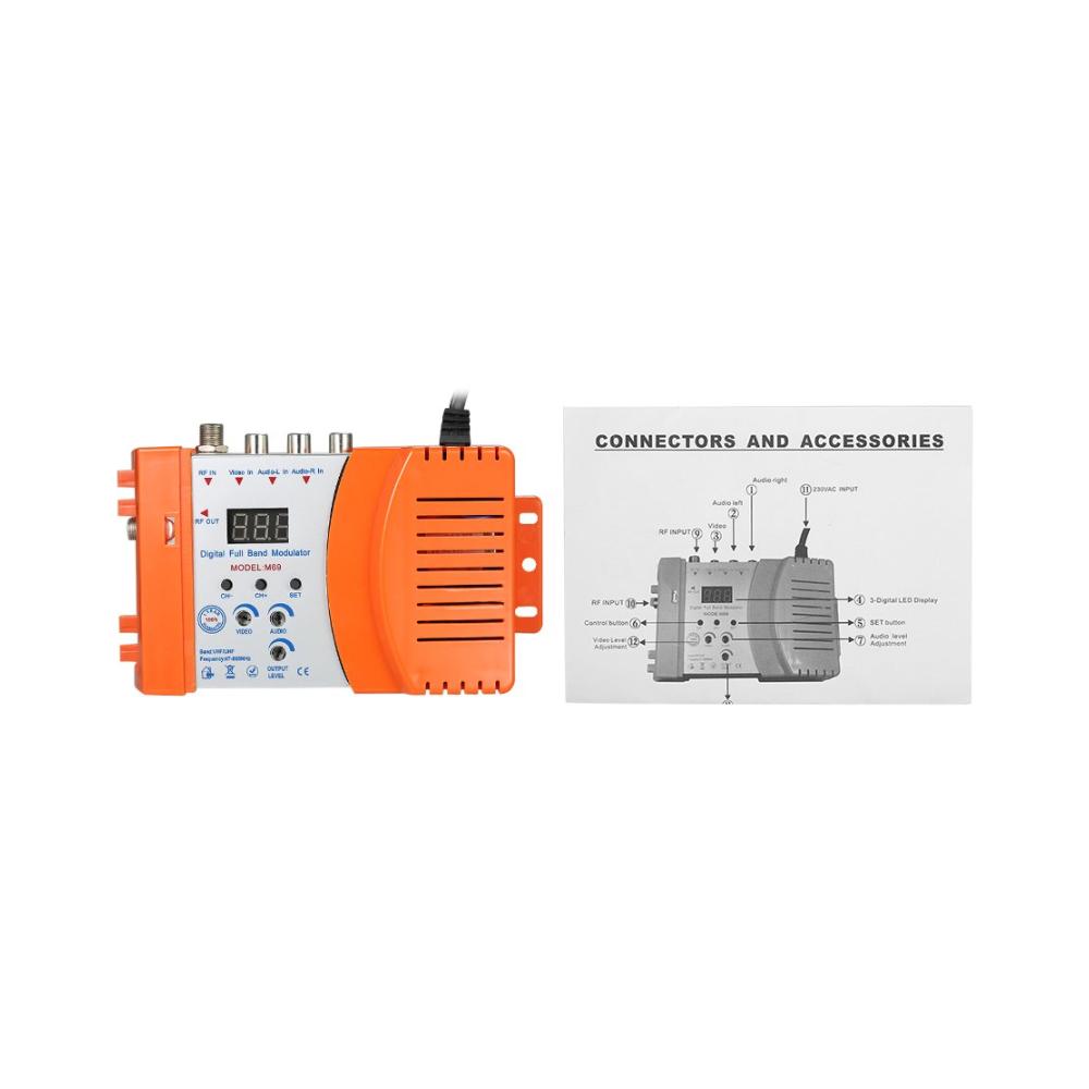 Dieser RF Modulator Digital RF Modulator Audio Video Konverter TV Signalverstärker UHF RHF AC120V wurde entwickelt, um RF- und TV-Signale aus A/V-Quellen zu erzeugen, die das Programm direkt über den Kanal auf Ihrem Fernseher sehen können. Weit verbreitet in Schulen, Shows, Geschäftspräsentationen und mehr. Eigenschaften: Benutzerfreundliches Design, einfach zu installieren und zu bedienen. Das leistungsstarke Schaltungsdesign sorgt für eine präzise Bildwiedergabe. Es kann Audio und Video über den Kanal in RF konvertieren. Betriebsfrequenz VHF/UHF 47–868 MHz. Mit wählbarer Audio- und Videoausgabe. Kompatibel mit allen lokalen CATV-Systemen. Spezifikationen: Buchsen-Typ: USA. US/EU (optional). Farbe: Blau / Orange (optional). Material: ABS Eingang: AC 230 V, 50 Hz. Max. Leistung: 3 W. Frequenzbereich: 47-868 MHz Ausgangsimpedanz: 750 Hz. Ausgangsstufe: 80-95dBuV Eingangspegel: 0,77 Vp-p für 80 % / – 10 % Modulation Soundsystem: M = 4,5 MHz, B / G = 5,5 MHz, I = 6,0 MHz, D / K = 6,5 MHz. Anschluss A / V: RCA Female RF-Eingang: F-Buchse. RF-Ausgang: F-Buchse. Betriebstemperatur: -10 ℃ ~ 60 ℃ / 14 ℉ ~ 140 ℉ Artikelgröße: ca. 15,5 x 8,6 x 5 cm. Artikelgewicht: ca. 356 g. Verpackungsgröße: ca. 16,5 x 10,8 x 5,5 cm. Paketgewicht: ca. 407 g. Lieferumfang: 1 x Modulator, 1 x Bedienungsanleitung (Englisch).