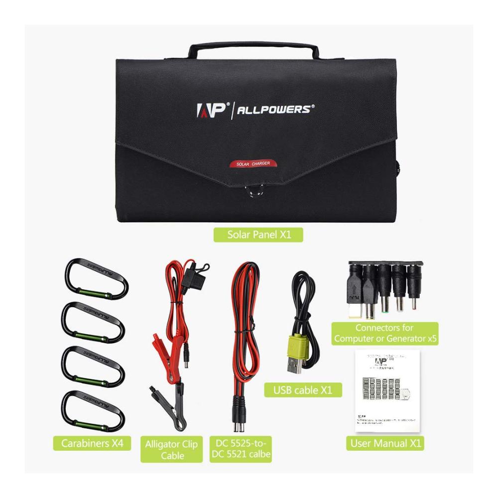• ▶【Packungsinhalt】: ALLPOWERS 100W Faltbares Solarpanel, 5 Model Laptop-Anschlüsse (Siehe Bild), DC 5.5×2.1mm zum 5.5×2.5mm Kabel, USB-Kabel, Alligator Clip Kabel, Karabiner, Bedienungsanleitung. Wir bieten 18 Monate Garantie und freundlicher Kundenservice.