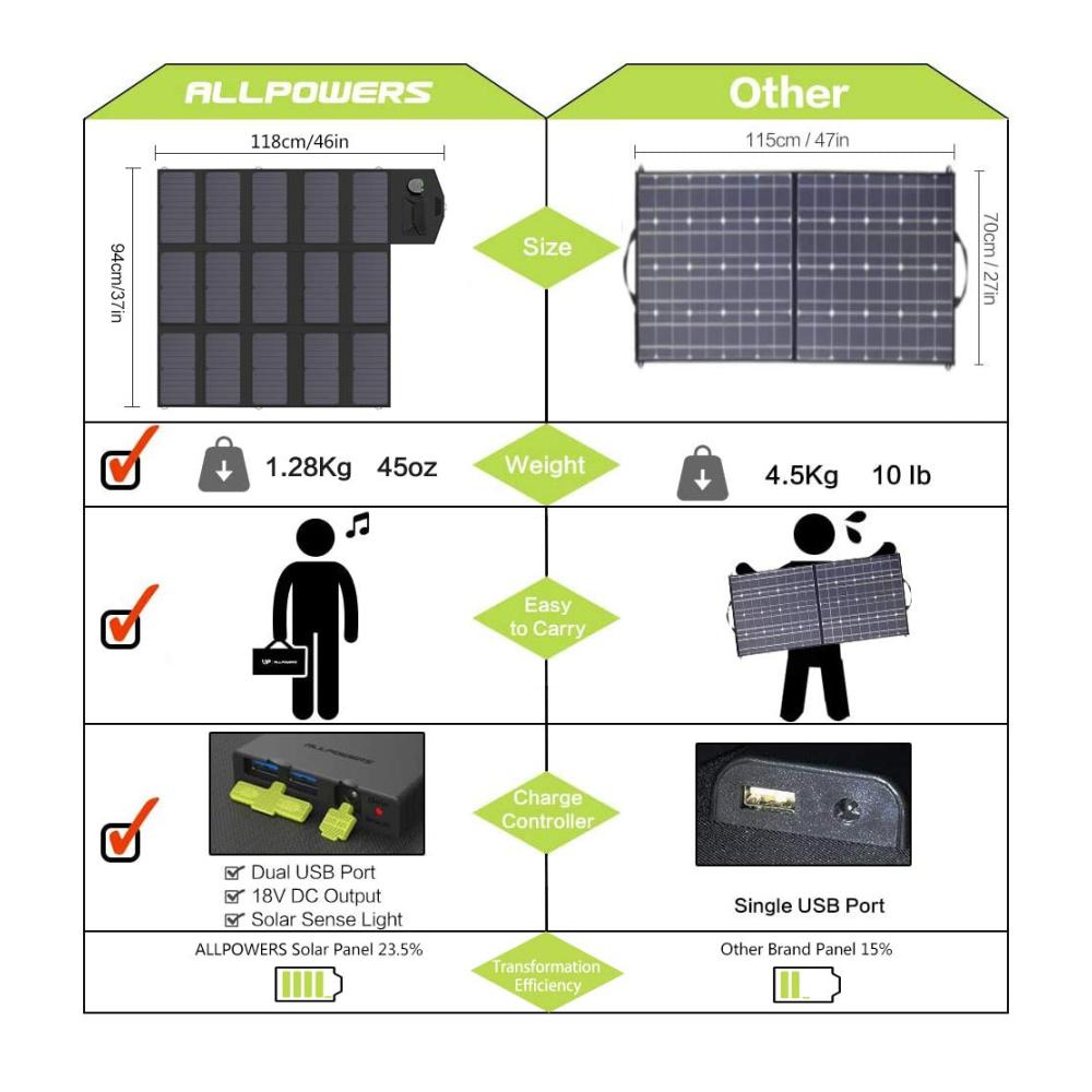 • ▶【Hohe Effizienz】: ALLPOWERS Faltbares Solarpanel has 100W Solarzelle wird von US erreichen eine Umwandlungseffizienz von 23.5%, die wasserdichte Oberflächenbehandlung schützt Solarzellen wirksam. Es ist mit den meisten Solargeneratoren auf dem Markt kompatibel.