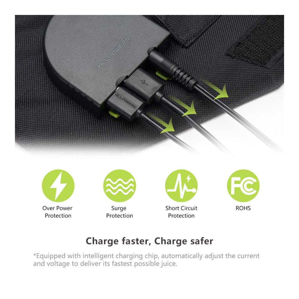 • ▶【3-in-1】: ALLPOWERS Faltbares Solarpanel hat zwei USB-Anschluss (5V / 2,4A pro Port) mit High Technology zum Laden von 5V Geräten(Z.B. Smartphone), 18V DC Ausgang (18V / 5A) zum Aufladen Ihres Laptop oder Ihrer 12V Autobatterie; Keine zusätzliche Batterie zum Laden externer Geräte erforderlich, 100% umweltfreundliche Energie.