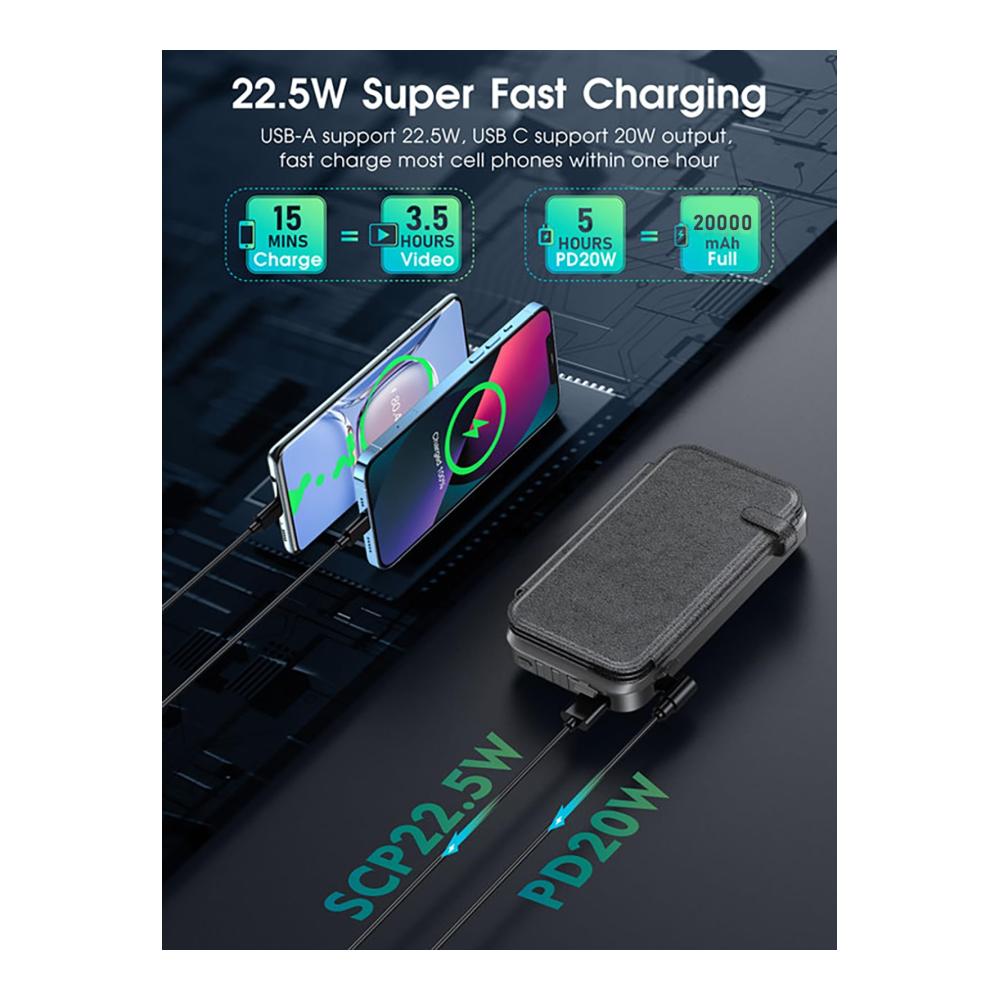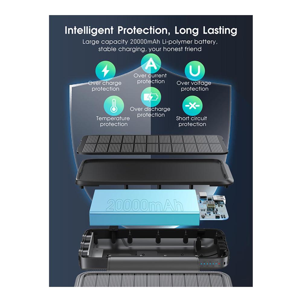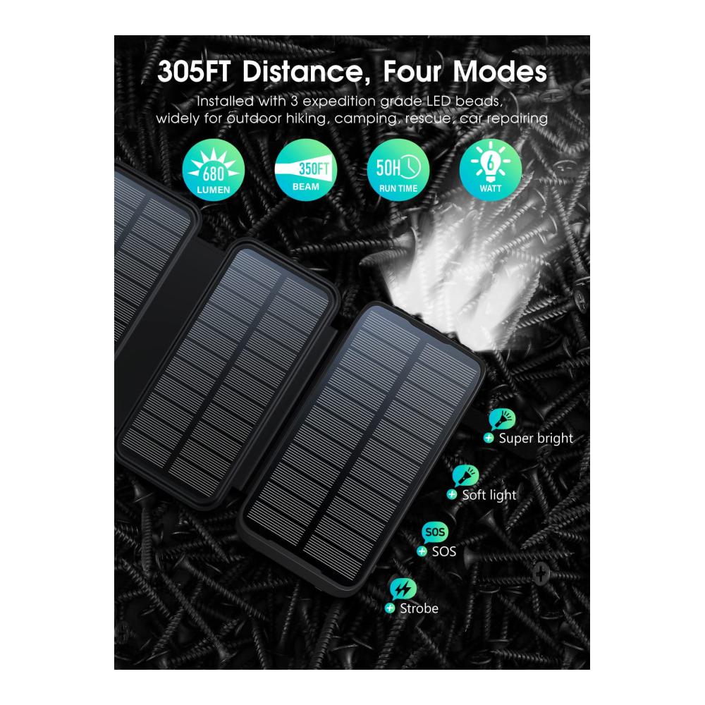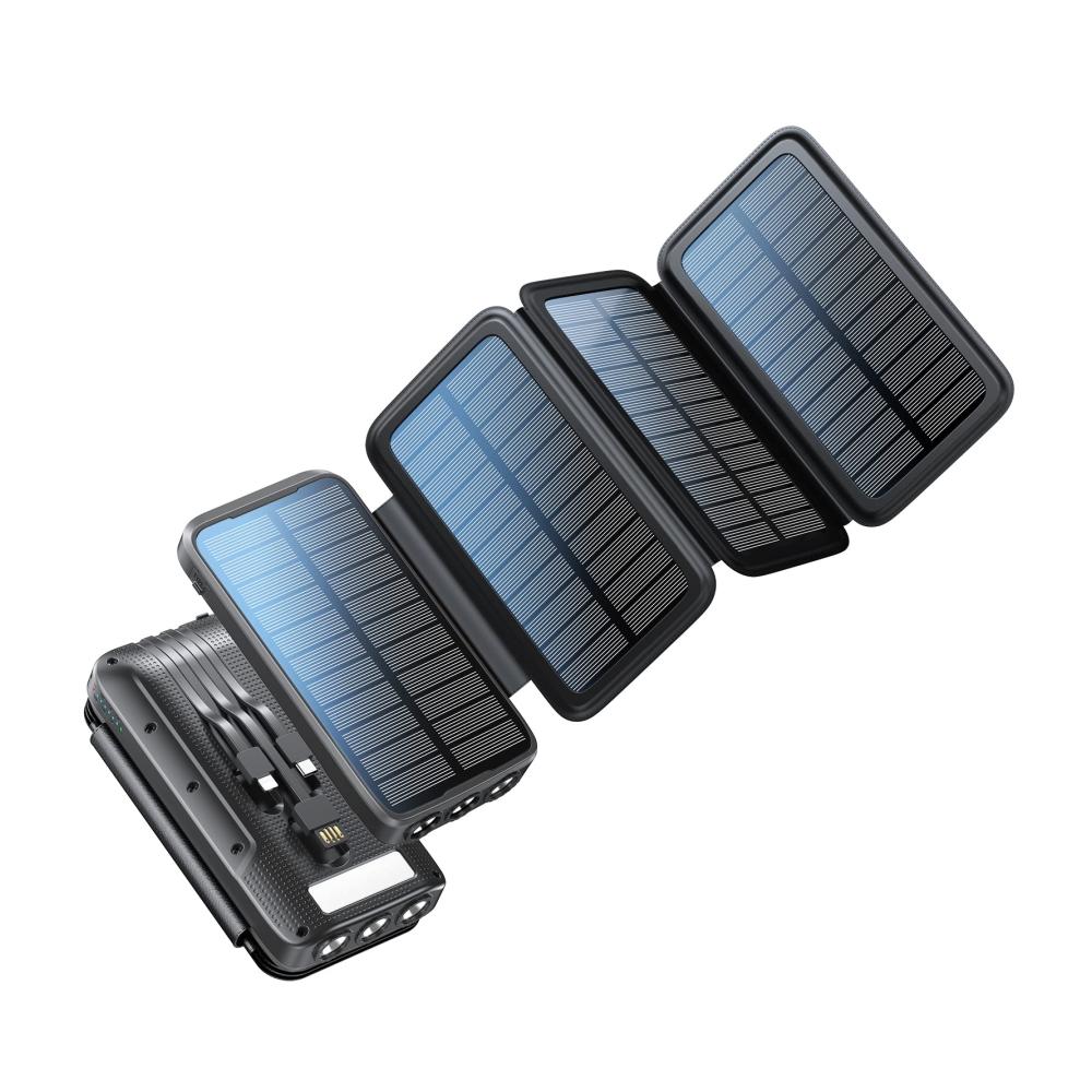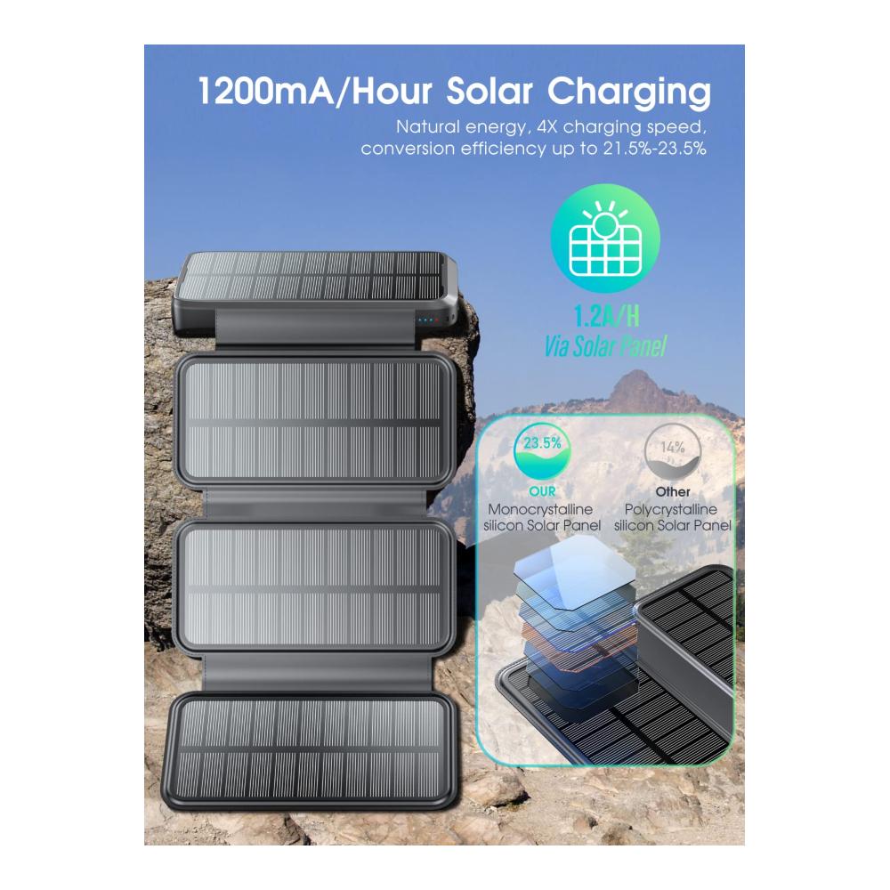 Unsere Solar Powerbank ist die ideale Lösung für unterwegs, egal ob beim Camping, Wandern oder einfach nur draußen in der Natur. Mit einer Kapazität von 20.000mAh und 4 faltbaren Solarpanels sind Sie stets mit Energie versorgt. Die integrierte 6W Taschenlampe bietet zusätzliche Sicherheit in der Nacht. Dank der Schnelllade-Funktion und den 3 mitgelieferten Kabeln (USB-A, Type-C, für Phone) können Sie Ihre Geräte mühelos aufladen. Die robuste und wasserdichte Konstruktion macht diese Powerbank zum perfekten Begleiter für alle Outdoor-Aktivitäten.
