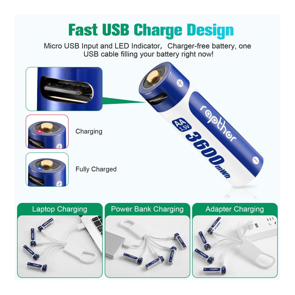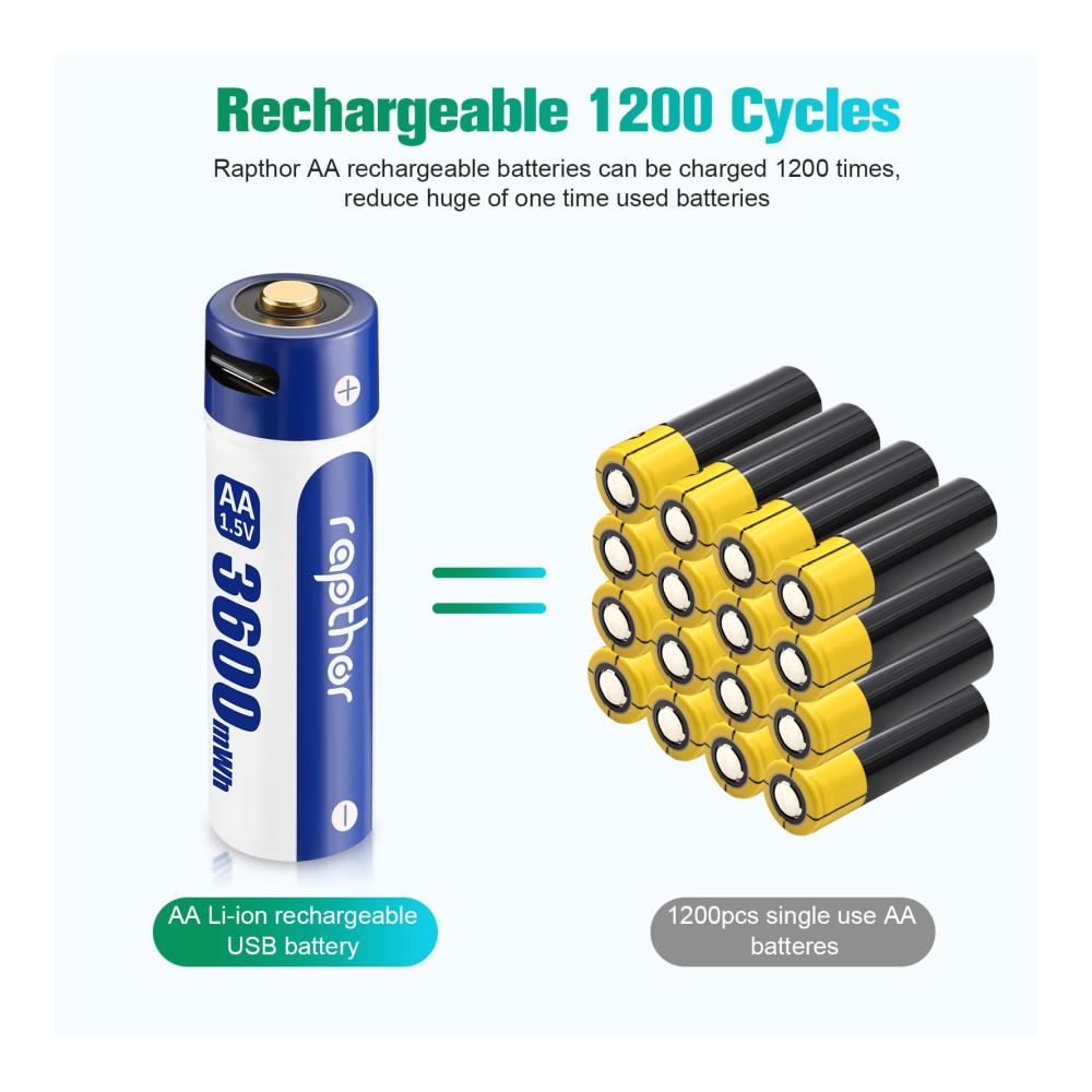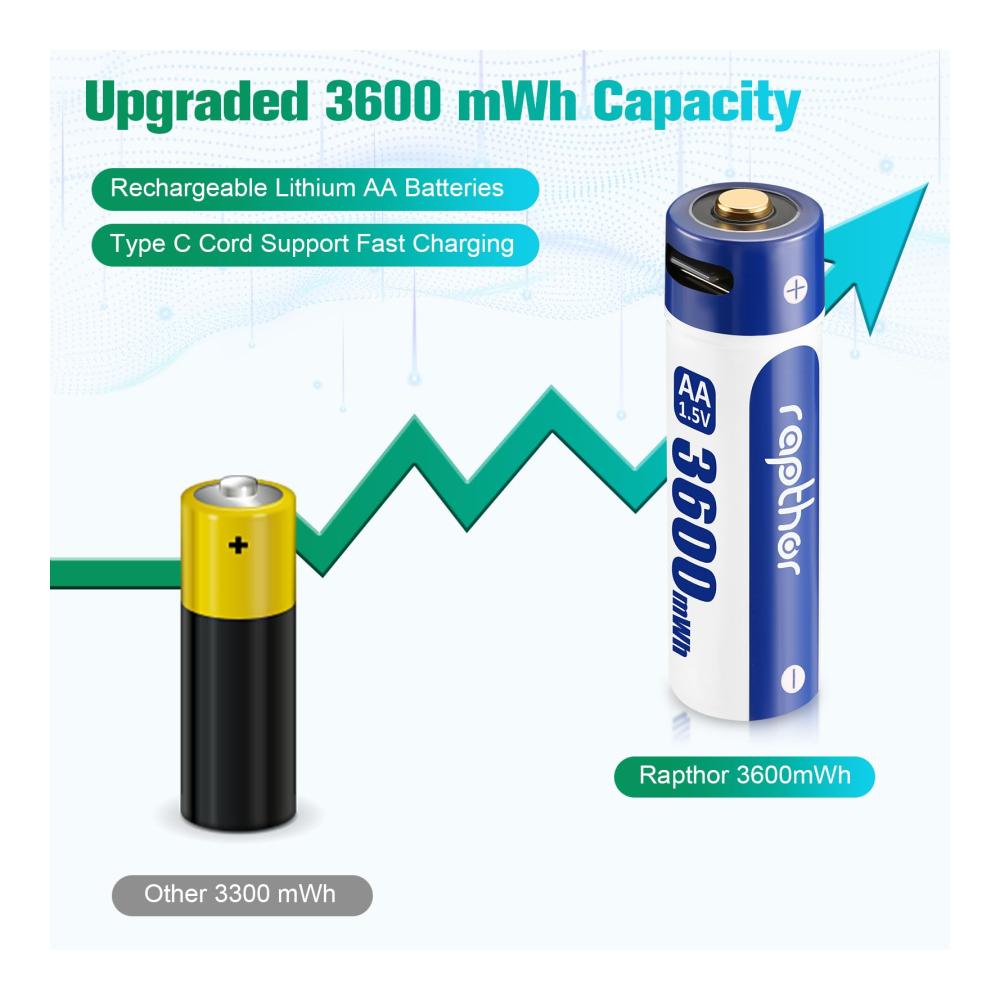 【Hohe Kapazität und langanhaltende Leistung】: Der Rapthor AA USB 1.5V wiederaufladbare Akku bietet eine beeindruckende Kapazität von 3600mWh. Dadurch erhalten Sie eine längere Nutzungsdauer für Ihre Geräte, ohne sie häufig aufladen zu müssen.