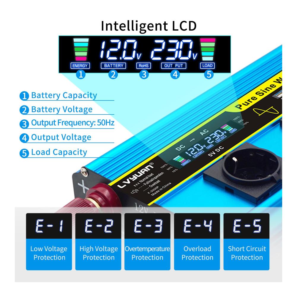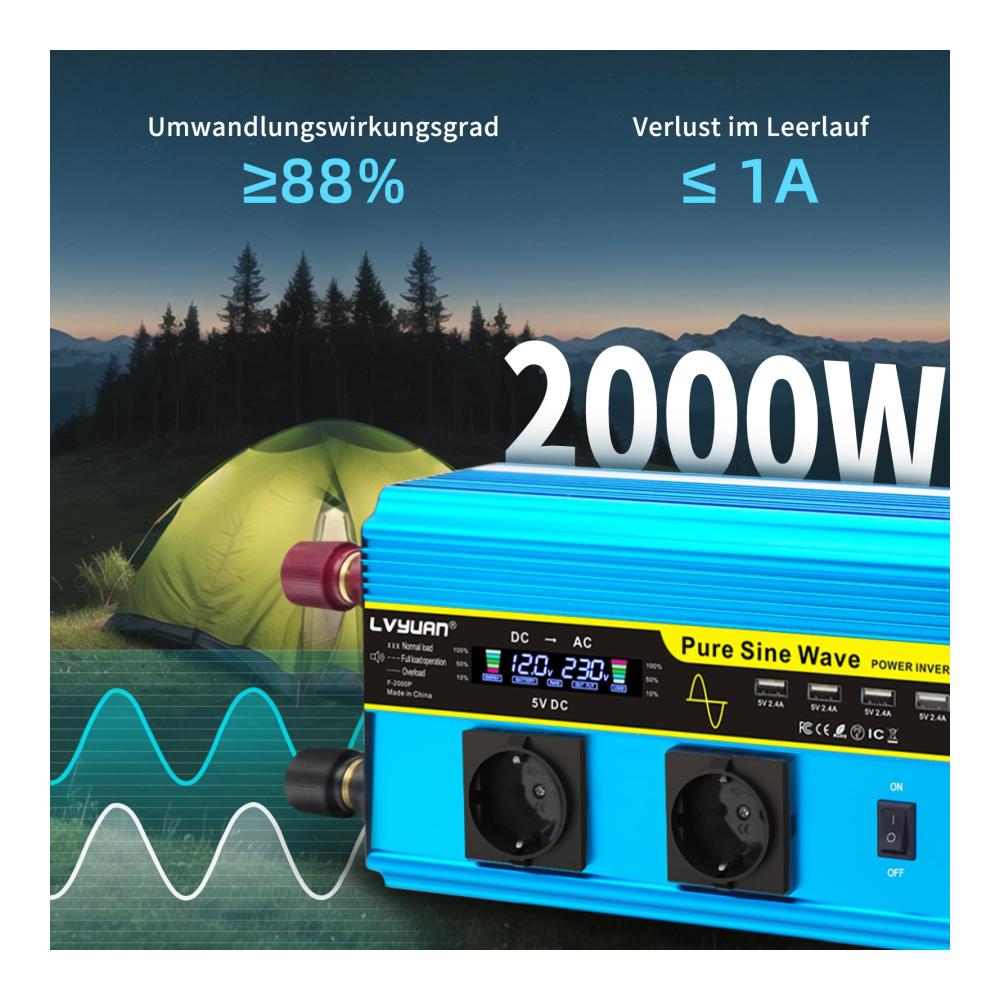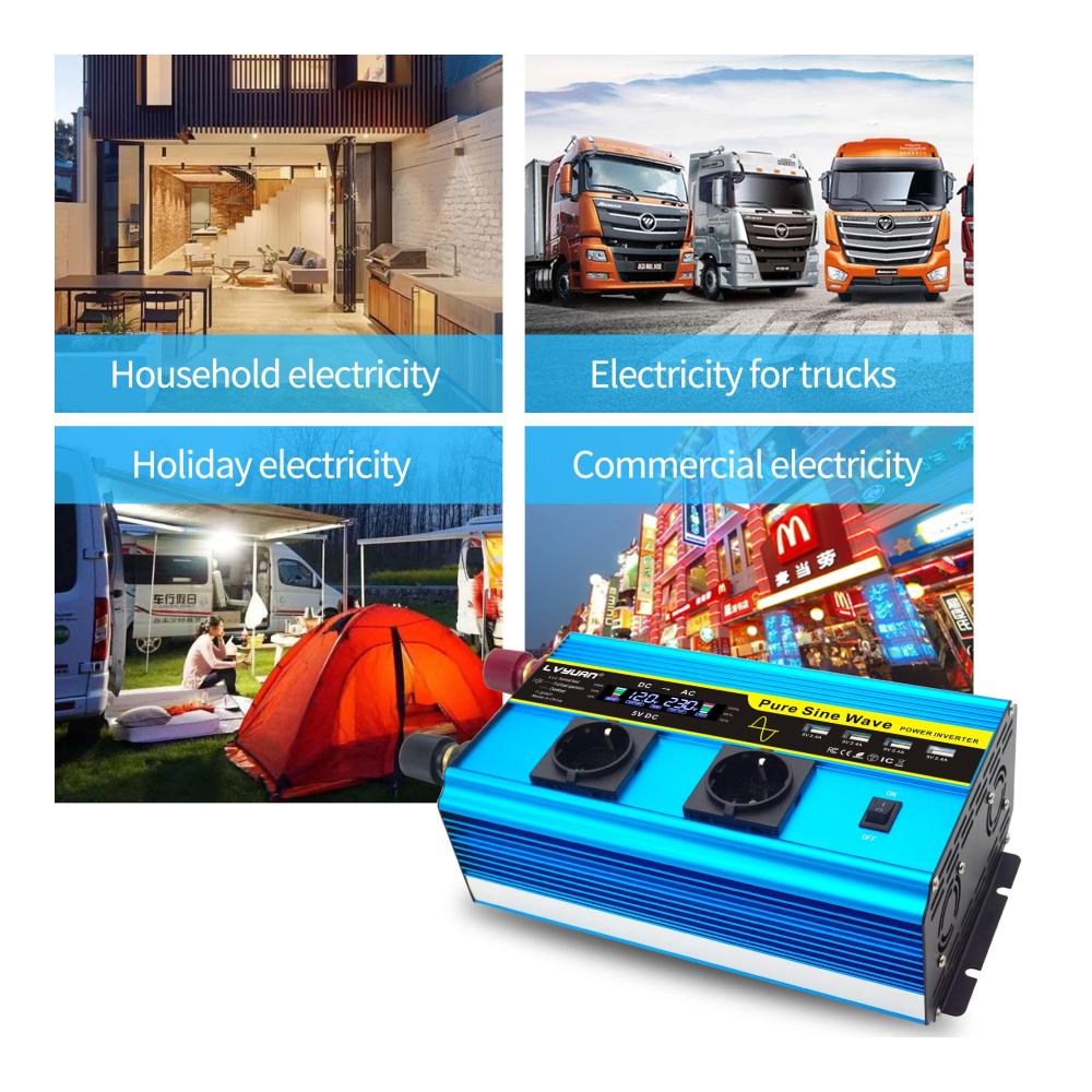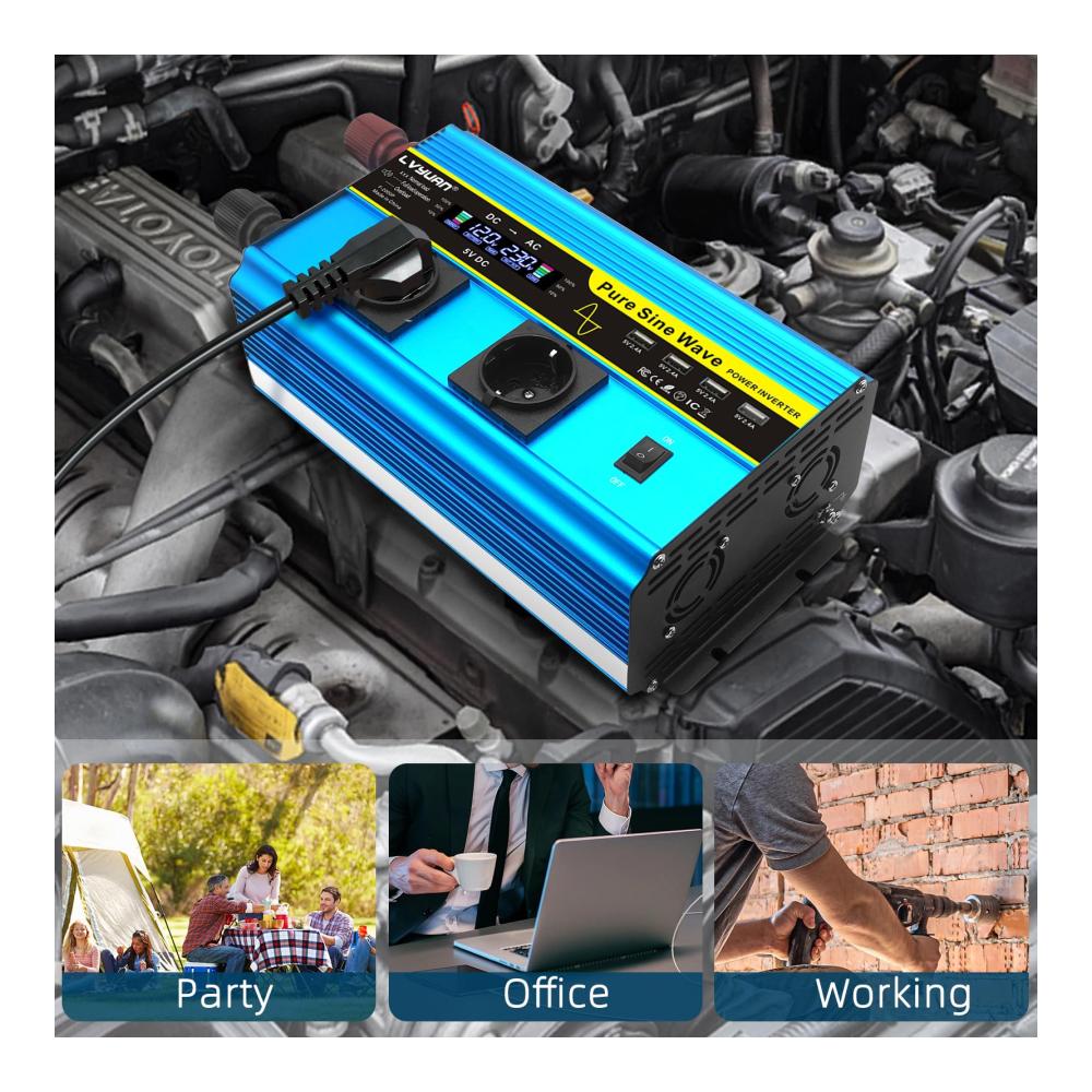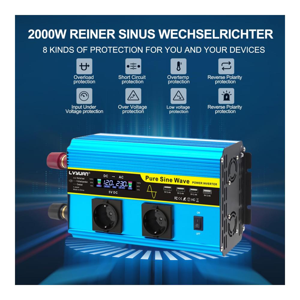 Unser Wechselrichter 12V auf 230V Reiner Sinus 2000W/4000W bietet leistungsstarke Konvertierung für unterwegs. Mit 2 AC-Steckdosen und 4 USB-Ports laden Sie mühelos Ihre Geräte auf. Bitte beachten Sie die Sicherheitsanweisungen für eine optimale Nutzung. Entdecken Sie die Vorteile eines zuverlässigen Wechselrichters für verschiedene Anwendungen.
