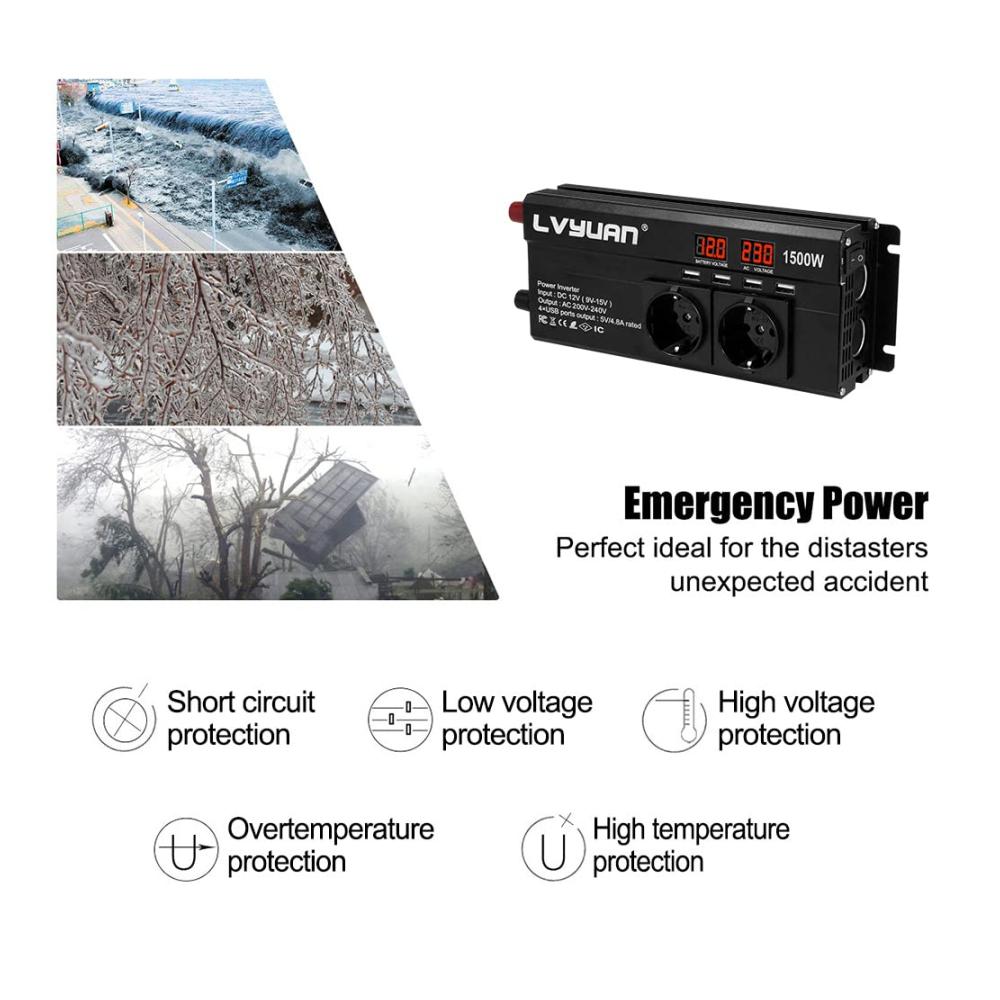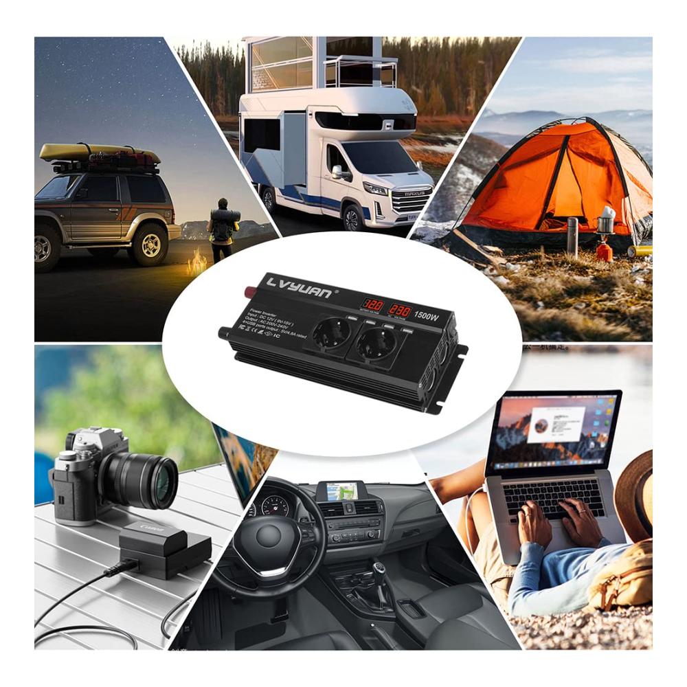 Unser LVYUAN Wechselrichter 1500W 12V 230V 240V Modifizierter Sinuswellen Spannungswandler bietet eine zuverlässige Stromquelle für unterwegs und zu Hause. Mit einer kontinuierlichen Leistung von 500W und einer Spitzenleistung von 1500W ermöglicht er vielfältige Anwendungen. Der Wechselrichter verfügt über Schutzfunktionen wie Überlast-, Kurzschluss- und Übertemperaturschutz für eine längere Lebensdauer. Dank der mitgelieferten Batterieklemmen und dem Zigarettenanzünderadapter ist er einfach zu installieren und zu verwenden. Bitte beachten Sie die Hinweise zur Verwendung in der Produktbeschreibung, um optimale Leistung und Sicherheit zu gewährleisten.