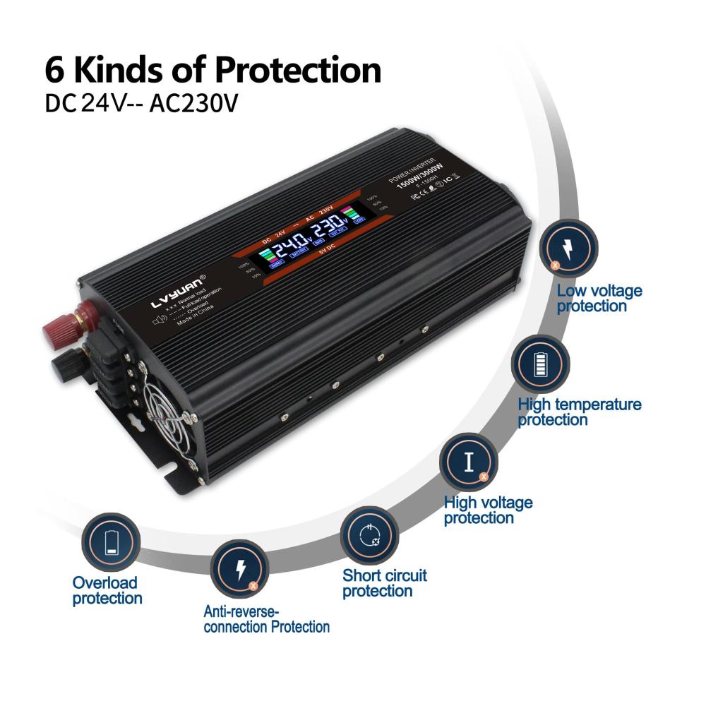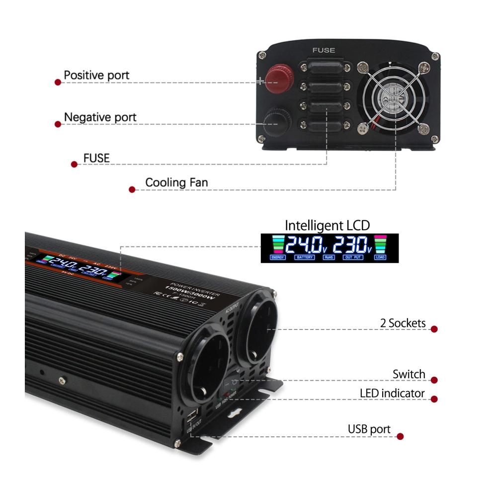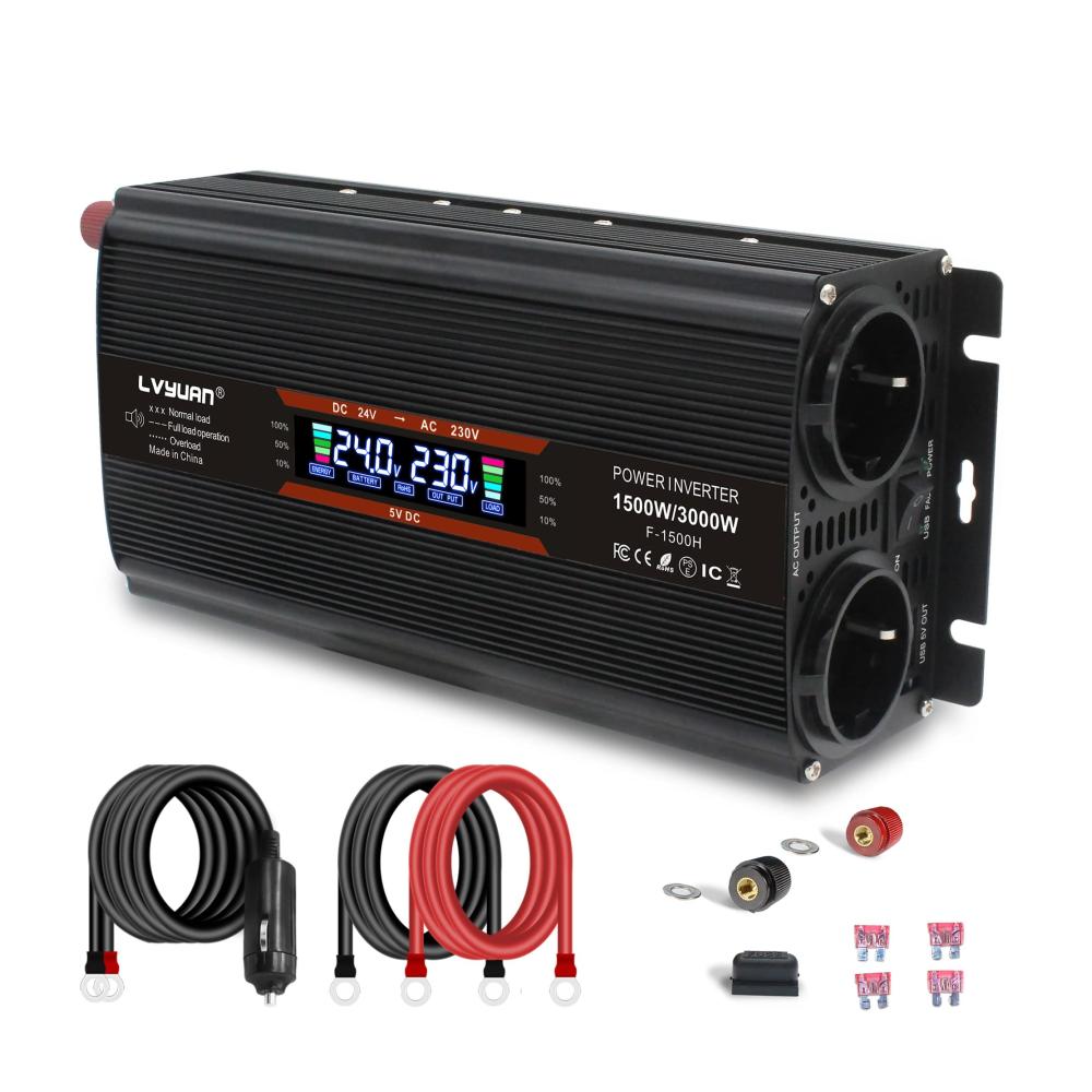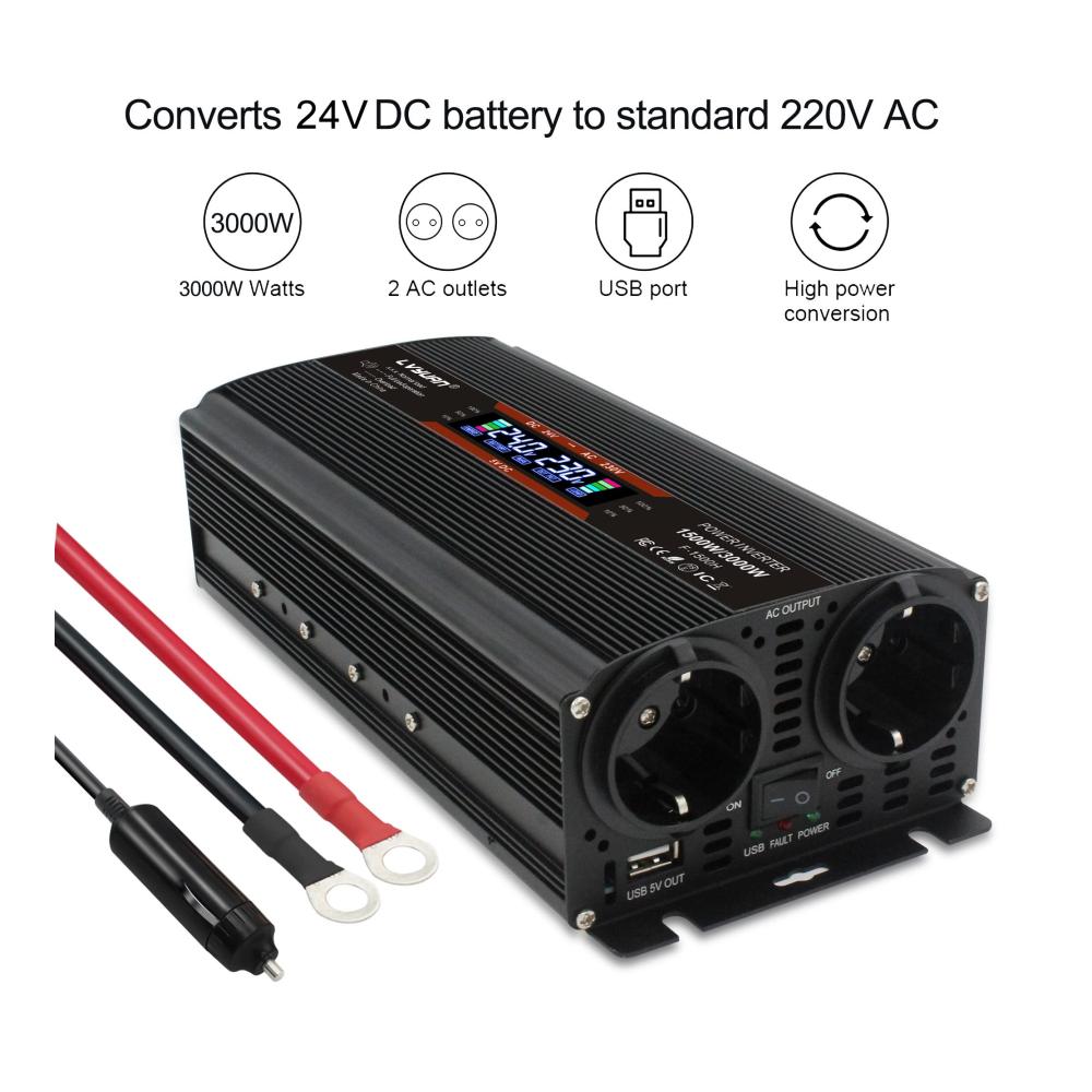 Premium 1500W / 3000W Wechselrichter – Hochwertige modifizierte Sinuswelle Wandelt 24V Gleichstrom in Wechselstrom von höchster Qualität um, der fast dem von zu Hause entspricht. Der neue Wechselrichter kombiniert hochwertige Handwerkskunst mit langlebiger Technologie qualitätsmodifizierte Sinuswelle, geeignet für den Betrieb vieler 230V Endgeräte. Dieses Gerät ist nicht für Nesspresso, Tassimo oder andere Kapselkaffeemaschinen geeignet.