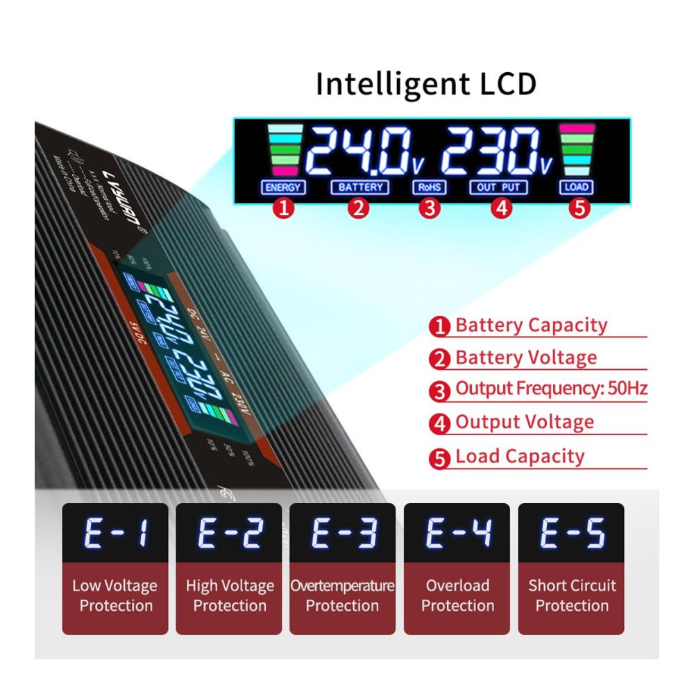 Hochwertige Komponenten – Dieser solarmodifizierte Sinus Wechselrichter verfügt über ein sehr kompaktes und robustes Aluminiumgehäuse für eine einfache Wärmeableitung. Alle von uns hergestellten Wechselrichter haben strenge Qualitäts und Kontrollanforderungen. Verwenden Sie nur Leistungstransistoren namhafter Hersteller. Mit Hilfe von Mit anderen hochwertigen elektronischen Bauteilen und der neuesten Hochfrequenztechnologie kann ein Wirkungsgrad von über 95% erreicht werden.
