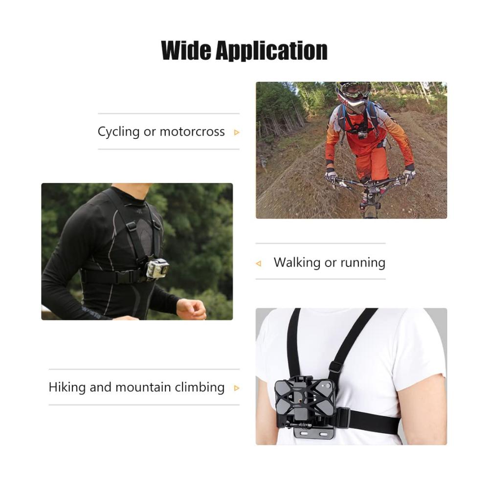 Spezifikationen: Farbe schwarz Material: Kunststoff und Polyester Breite des Telefonclips: 5,3–10 cm Größe der Silikonmatte: 11,4 * 5,8 cm / 4,4 * 2,2 Zoll Brustgurt: 36 * 34 cm / 14,1 * 13,1 Zoll Gewicht Brustgurt: 123g/ 4.3ozNotiz: Die abgebildeten Sportkameras und Smartphones sind nicht im Lieferumfang enthalten.Paketliste: 1 * Brustgurt 1 * J-Haken 1 * Rändelschraube 1 * Adapterschraube 1 * Telefonclip 1 * Silikonmatte
