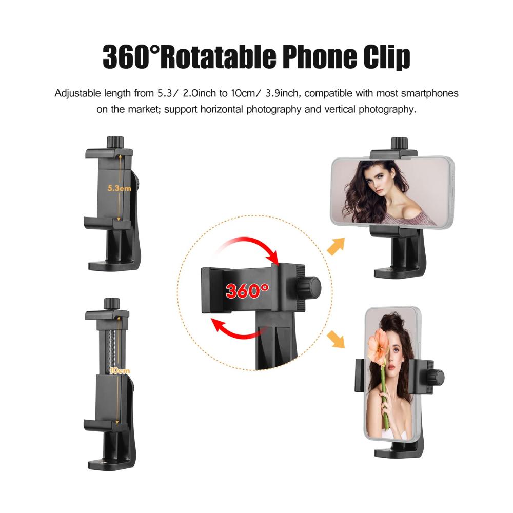 [Drehbarer Telefonclip und Silikonmatte] Einstellbare Länge von 5,3/2,0 Zoll bis 10 cm/3,9 Zoll, unterstützt horizontale und vertikale Fotografie; mit Silikonmatte zur besseren Fixierung des Telefons, um ein versehentliches Herunterfallen zu verhindern.
